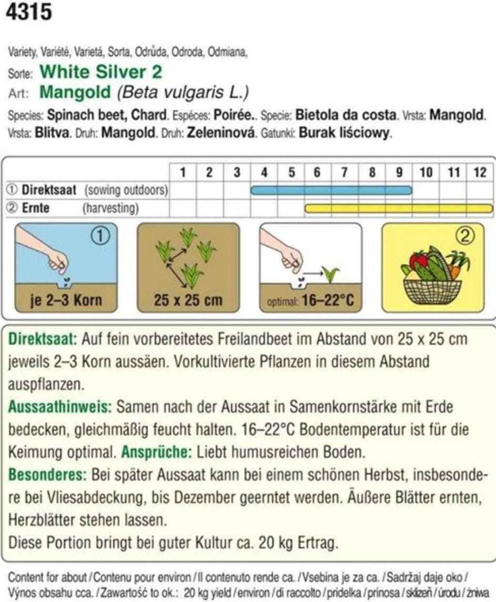 La acelga tiene hojas verdes y se puede cosechar hasta diciembre si se siembra tarde. En los meses siguientes, conviene cubrirla con una lámina protectora si es posible. Prefiere suelos ricos en humus.
