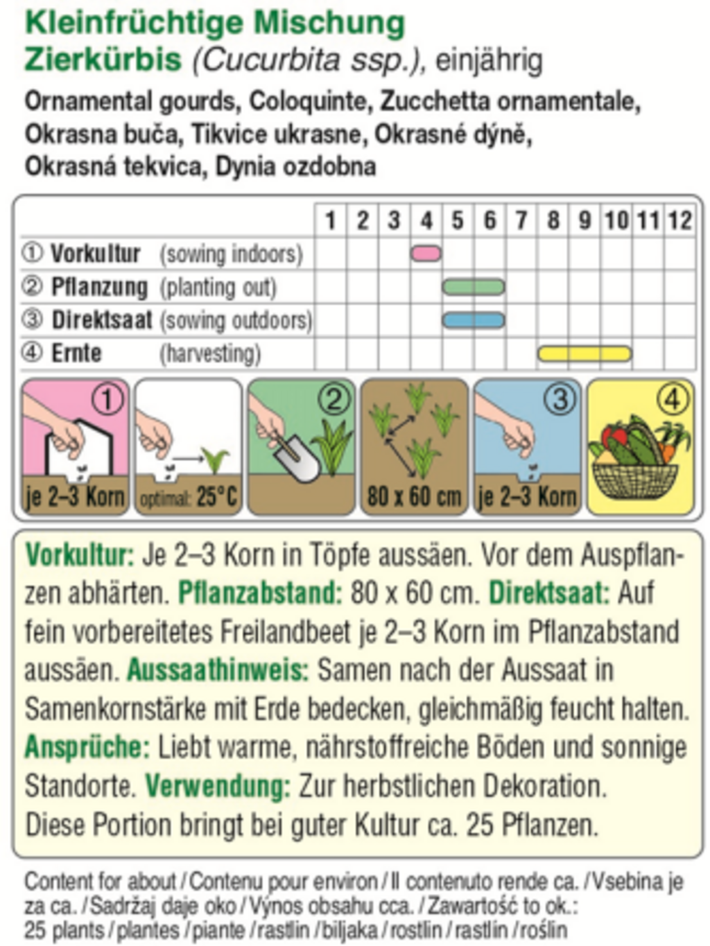 Esta mezcla permite cultivar hermosas calabazas ornamentales anaranjadas o blancas que se pueden cosechar entre agosto y octubre. Una vez cosechadas, las calabazas deben dejarse secar.