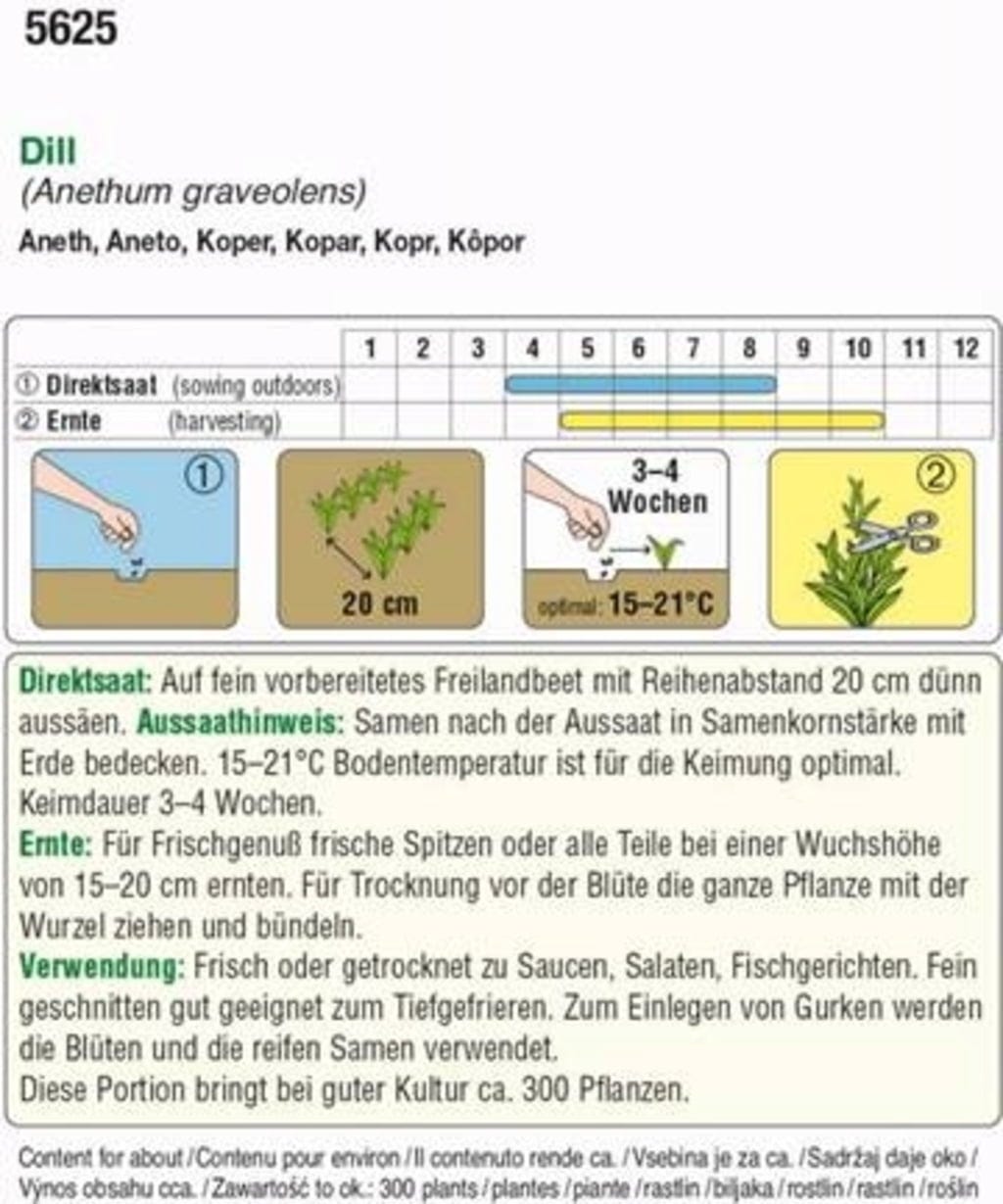 Las puntas frescas o las partes enteras deben cosecharse cuando alcanzan una altura de 15 a 20 cm. El sabor refrescante de esta variedad combina especialmente bien con salsas, ensaladas y platos de pescado. Las flores y las semillas maduras también se pueden utilizar para preparar pepinos encurtidos. Esta variedad de eneldo también es apta para congelar o deshidratar.