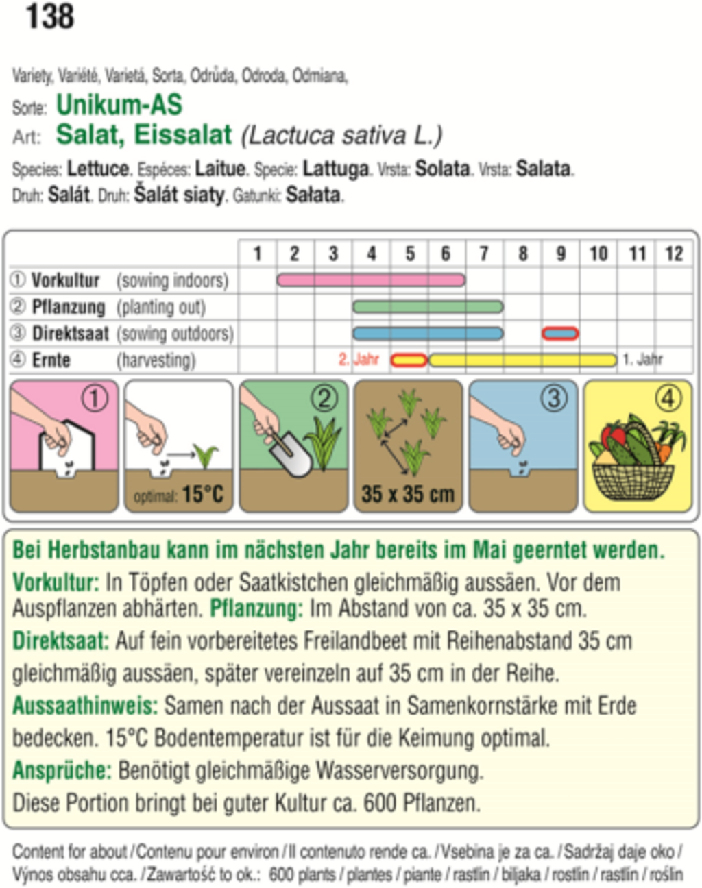 Unikum-AS tiene hojas rizadas con borde rojo y es muy popular en ensaladas de verano y otoño. Con un buen cultivo, esta bolsa produce unas 600 plantas.