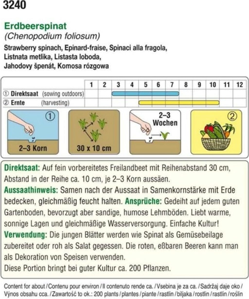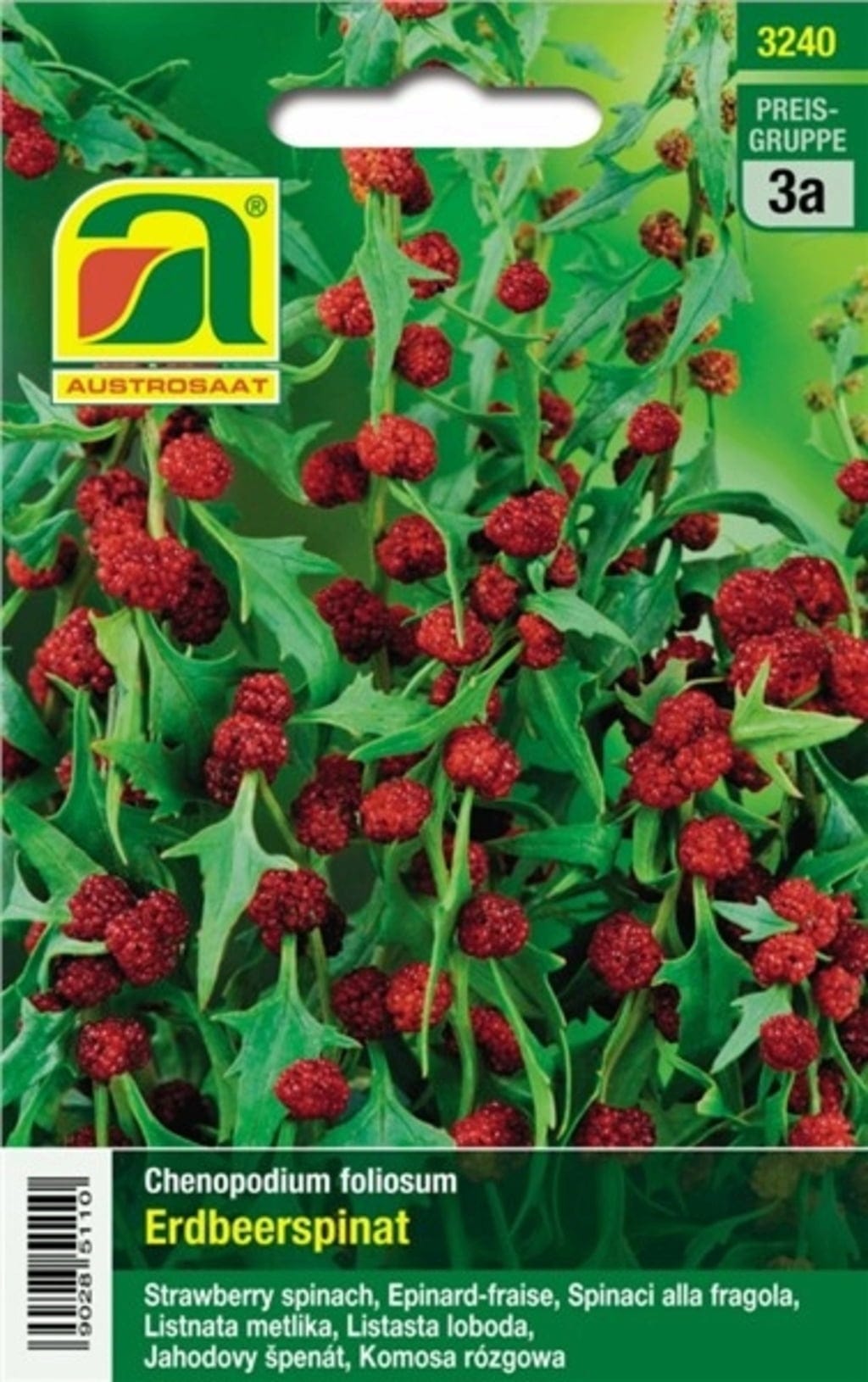 Instrucciones: Las hojas se preparan como espinacas o se comen crudas en ensalada. Las bayas rojas comestibles se pueden usar como guarnición. La espinaca fresa es apta para congelar.