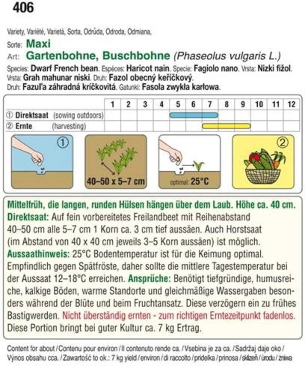 Esta variedad de judía enana produce vainas sin hebras. Gracias a su maduración temprana, el Maxi permite cosechas más largas que otras variedades.