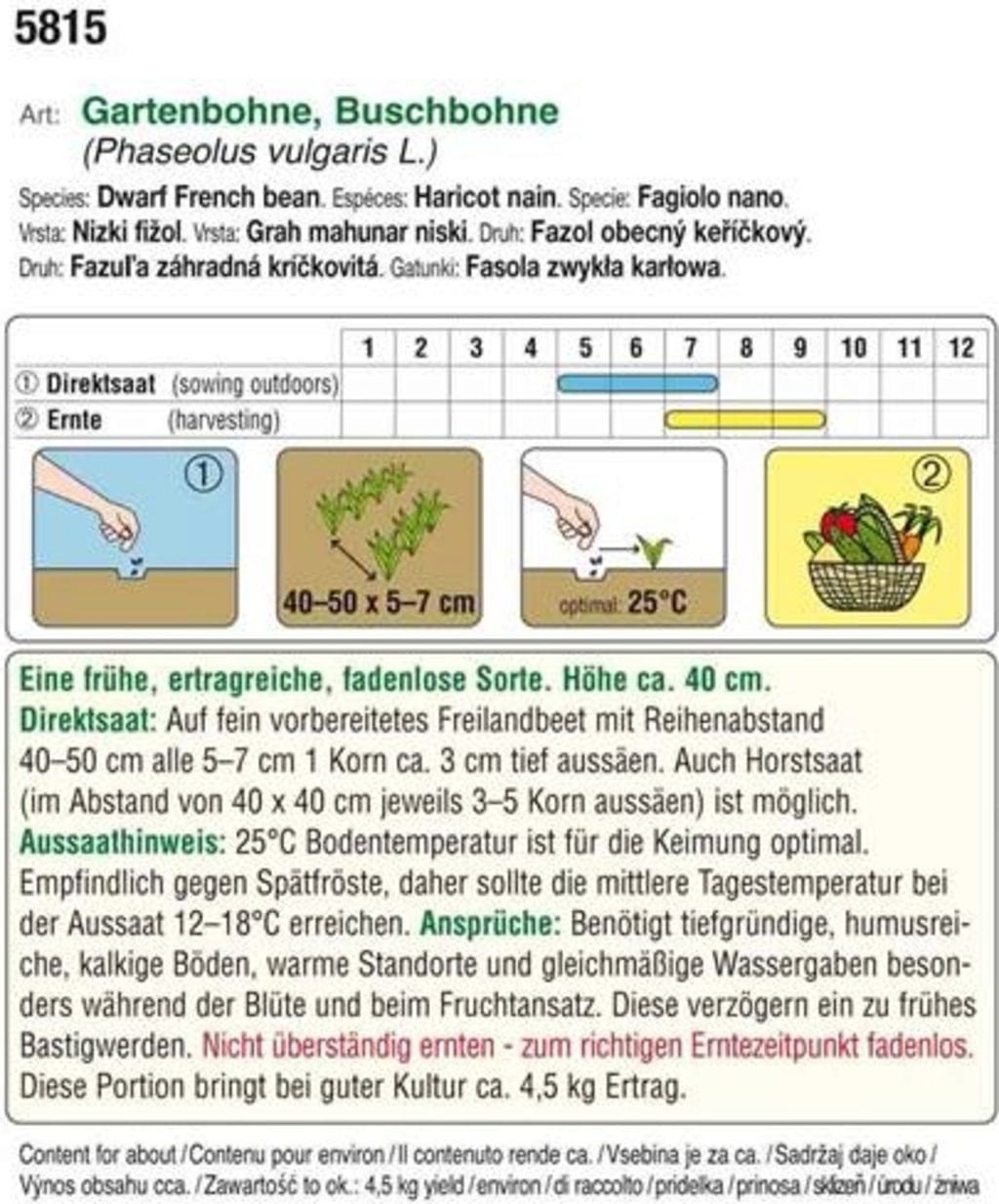 Esta variedad produce plantas que pueden alcanzar los 40 cm de altura y tiene vainas largas, rectas y sin hilos.