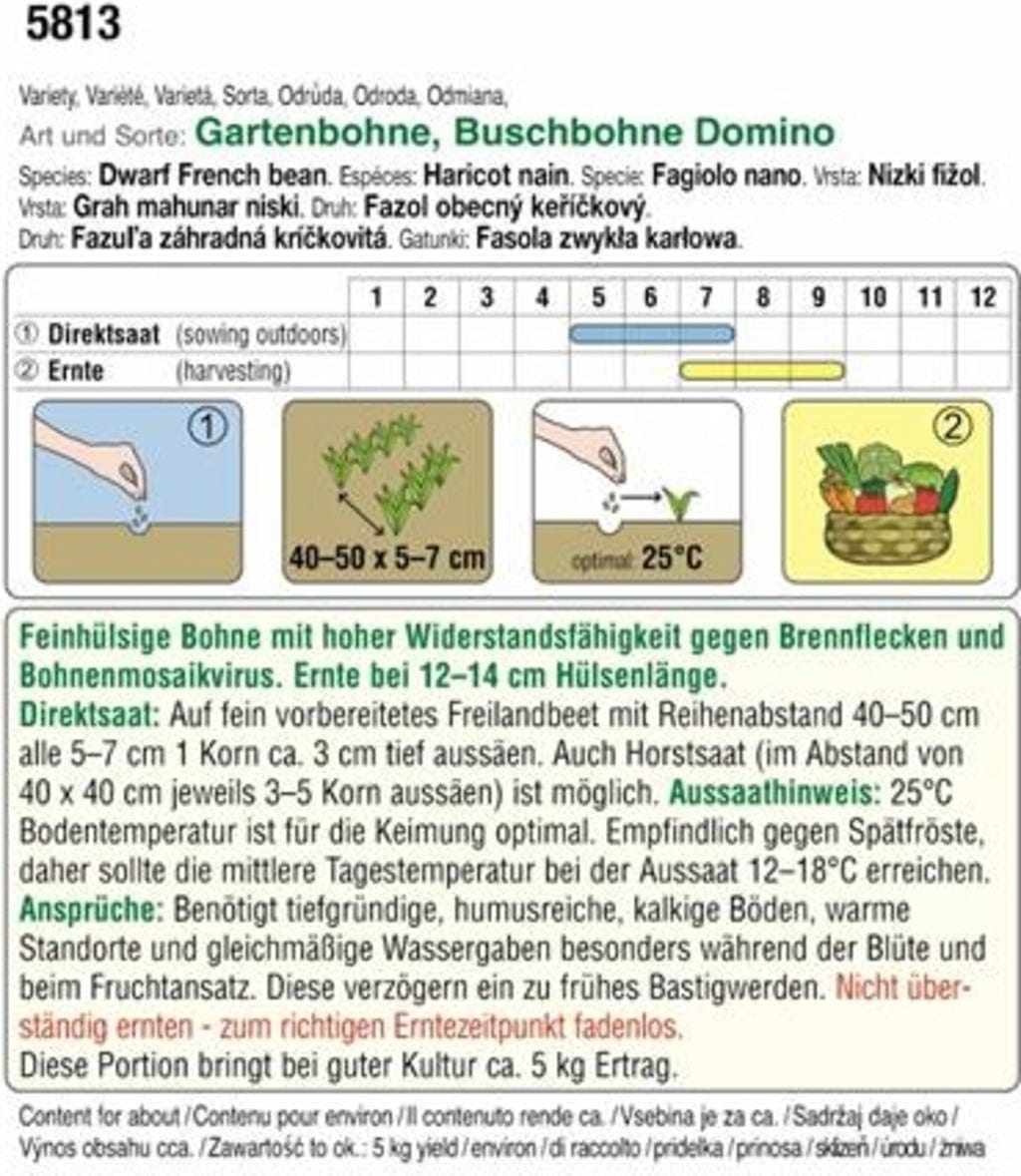La judía enana Domino orgánica tiene vainas muy finas de color verde intenso. Cocinada, es la base ideal para deliciosas ensaladas y guarniciones. Si se cosecha en el momento oportuno (longitud de vaina: 12-14 cm), no tiene hebras. Cabe destacar su alta resistencia al virus del mosaico del frijol.