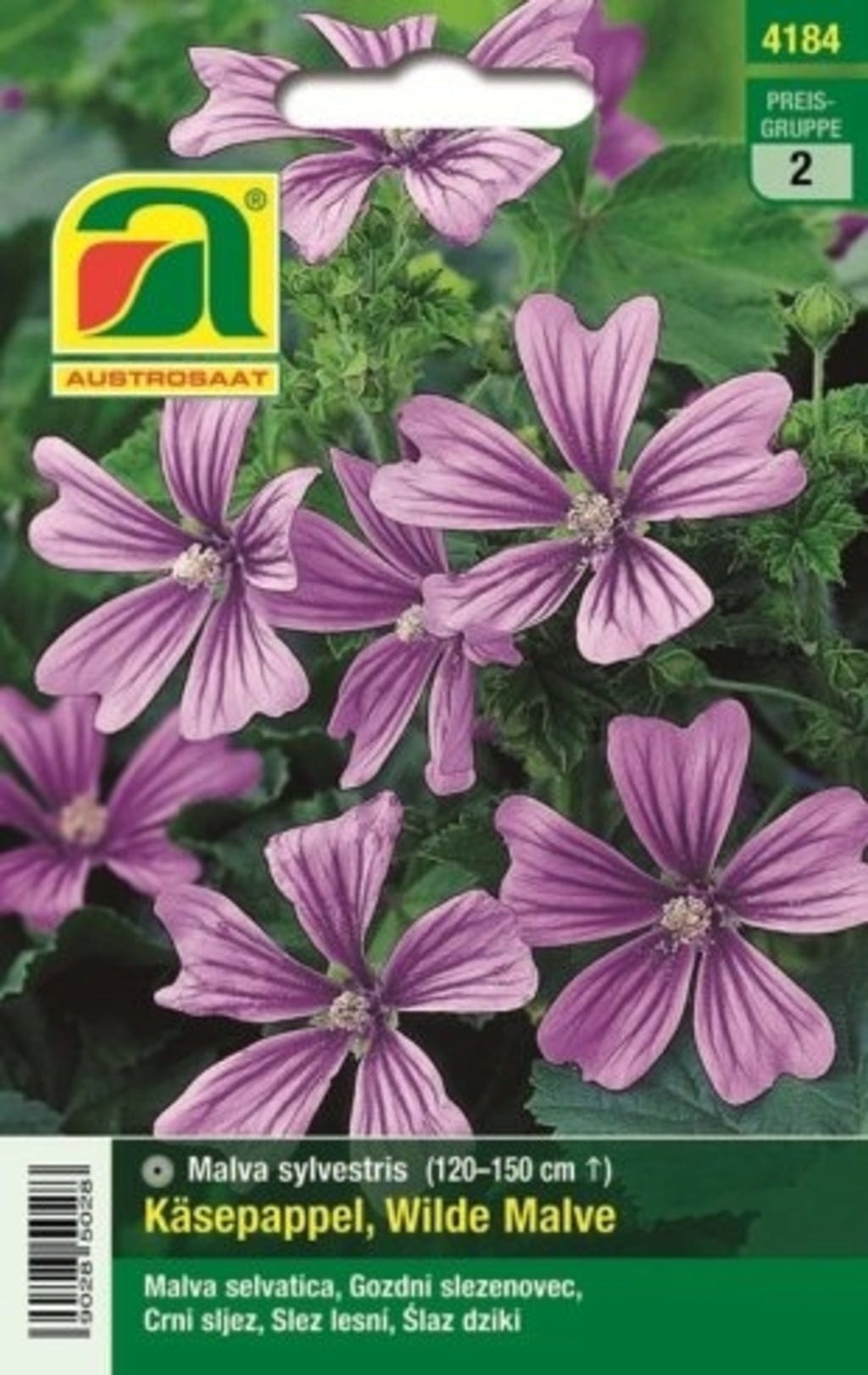 Esta variedad de malva presenta flores de color púrpura veteado. Una vez cosechadas, las flores y las hojas se pueden secar y usar en infusiones medicinales.