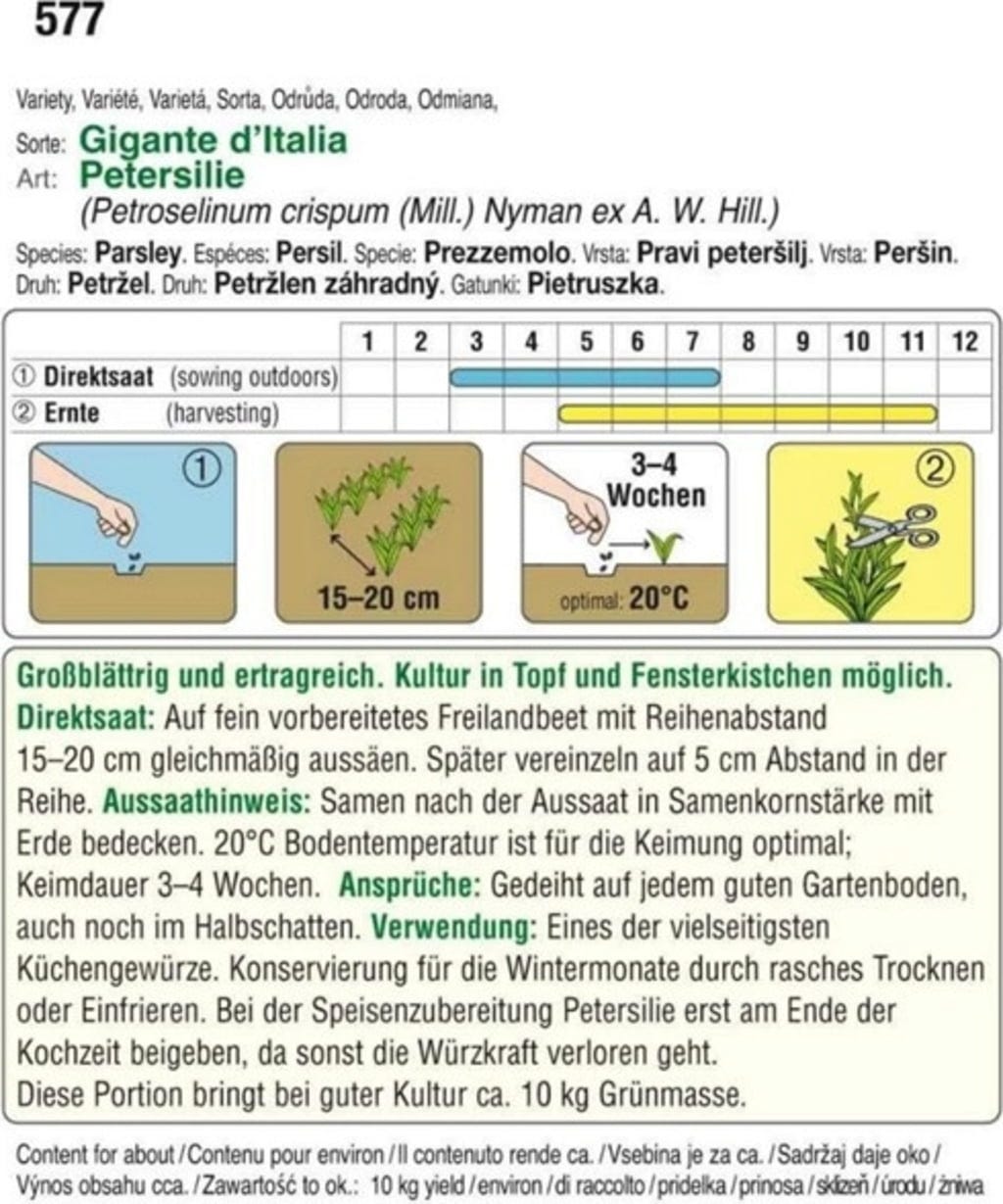 Esta variedad, que se puede cultivar en macetas de alféizar, tiene hojas grandes y robustas. Una vez cosechado, el perejil se puede congelar o secar.