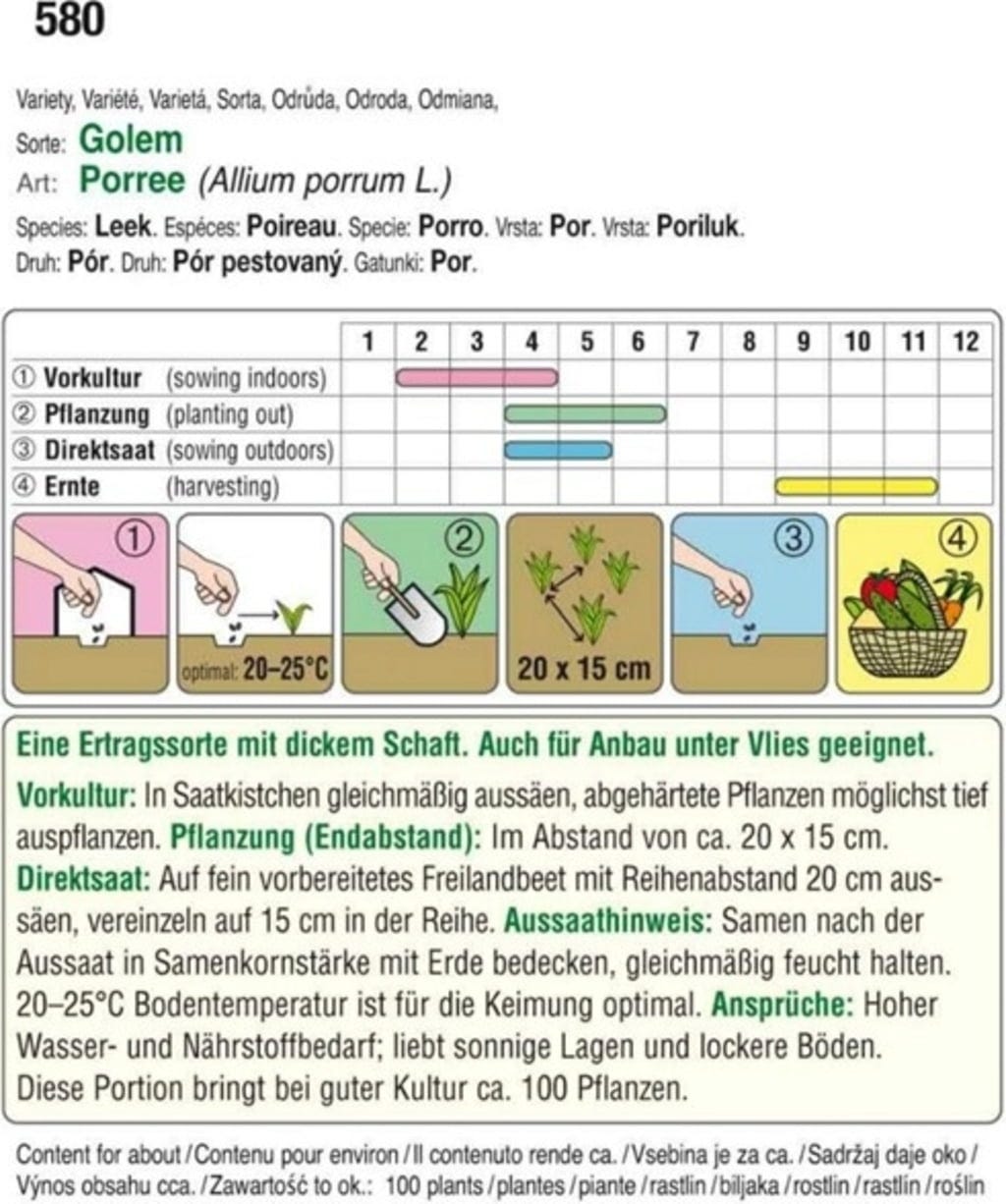 La variedad Golem tiene tallos muy gruesos y se puede cosechar en invierno. En buenas condiciones de cultivo, puede producir hasta 100 kg de puerros. También se puede cultivar bajo una cubierta protectora.