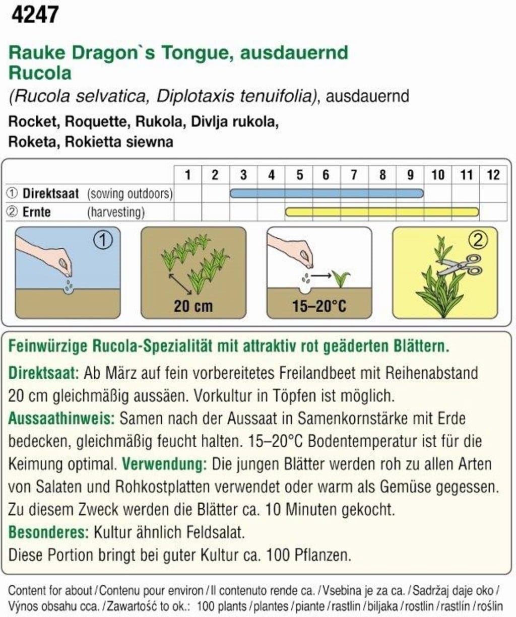 ¡Dale un toque de color a tu ensalada con rúcula silvestre! Se usa de forma similar a la rúcula y también se puede cocinar: simplemente blanquéala durante 10 minutos y añádela a tus platos justo antes de servir. En condiciones favorables, un paquete puede producir hasta 100 plantas.