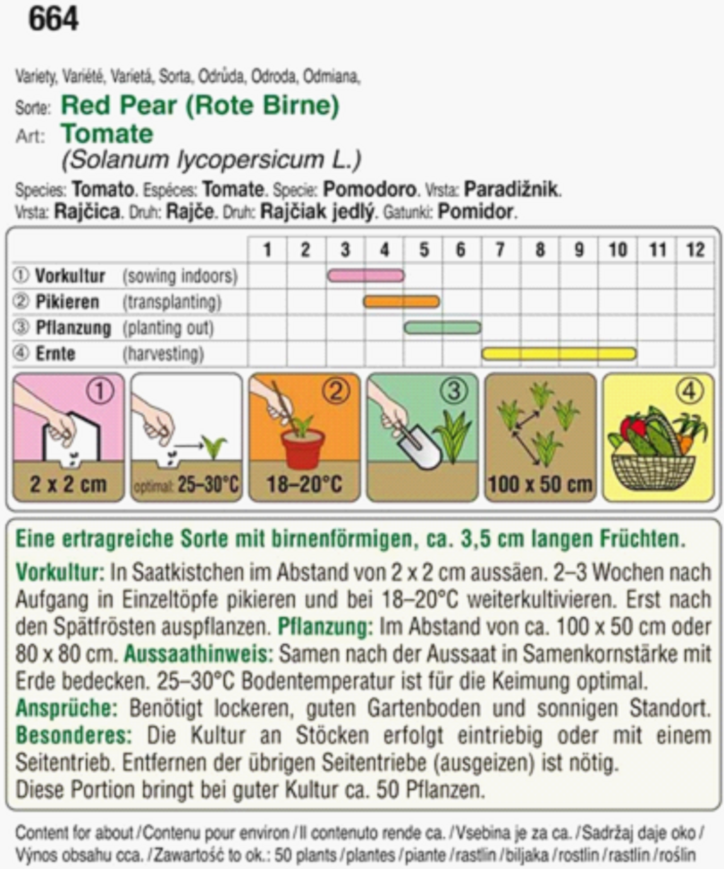La variedad "Pera Rossa" produce tomates alargados que se asemejan a peras rojas. Los frutos pueden alcanzar unos 3,5 cm de largo y son un delicioso acompañamiento para ensaladas.