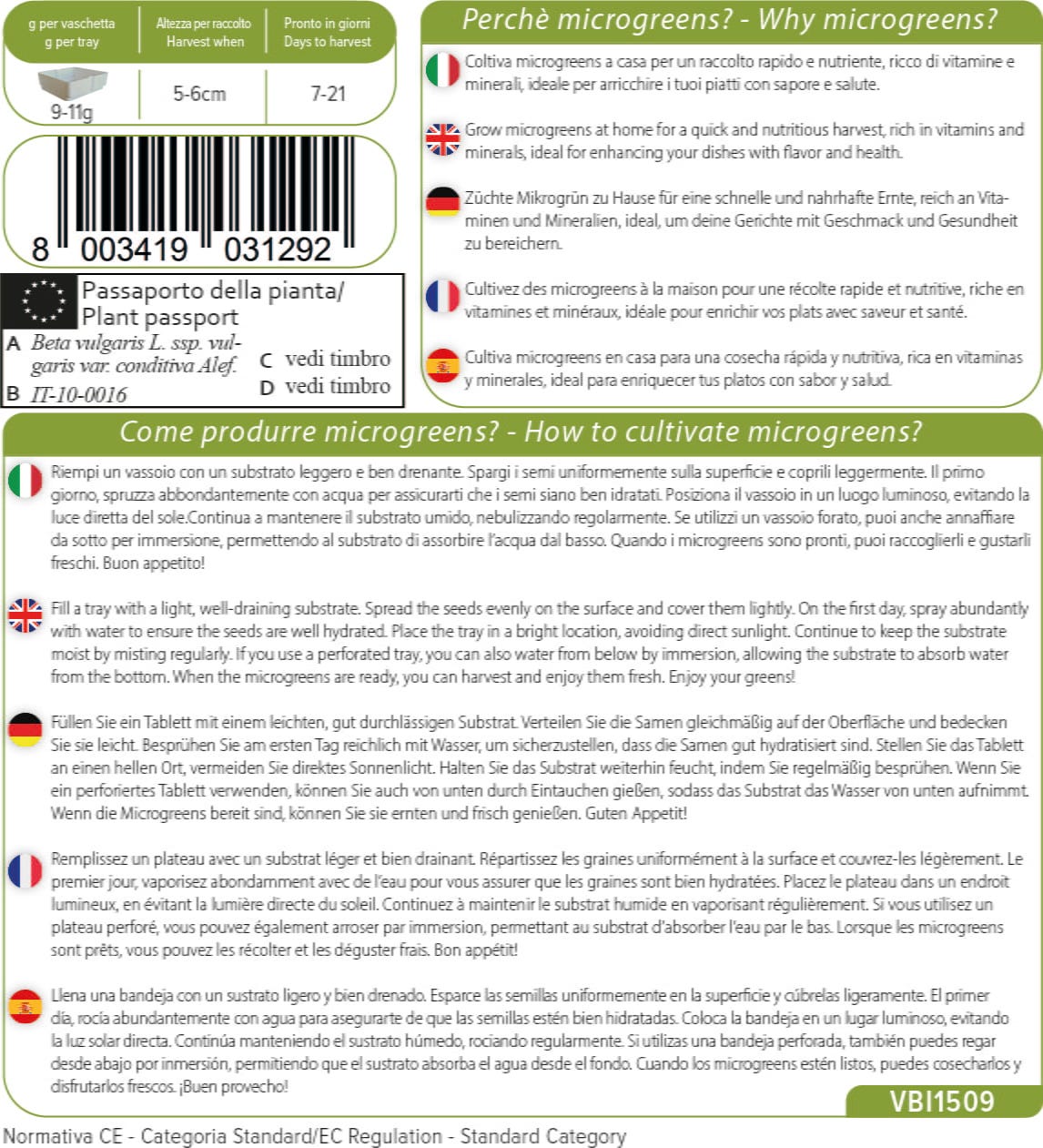 Consejos de cultivo: Esparce las semillas uniformemente sobre un sustrato drenante. Mantén las plántulas uniformemente húmedas hasta una altura de 5-6 cm y evita el sol directo en las horas centrales del día para preservar la delicada textura y los brillantes colores de los tallos.