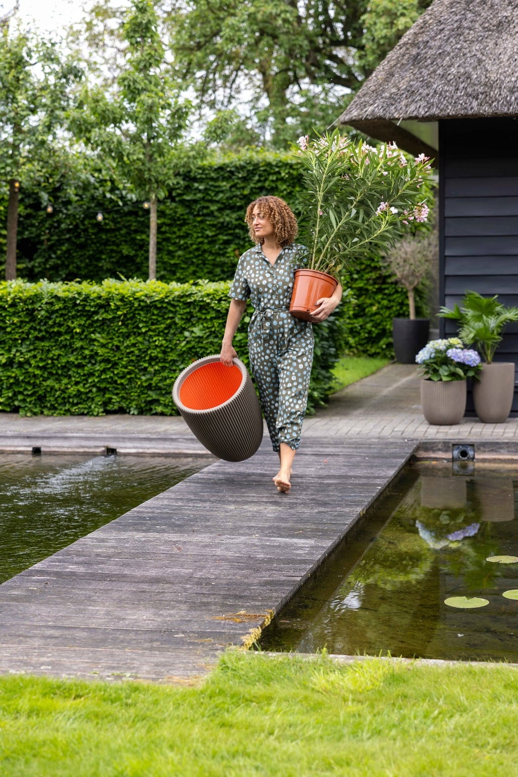 El interior naranja brillante de la maceta recuerda sus orígenes holandeses y ofrece algo más que un simple acento visual: la capa aislante integrada protege las plantas de forma fiable de las heladas en invierno y del calor en verano.