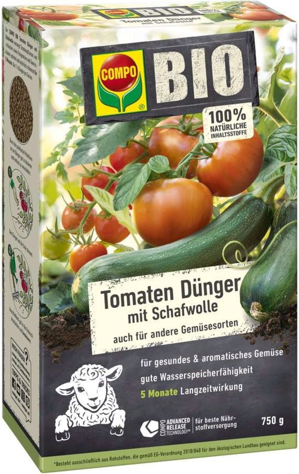 El fertilizante ecológico de lana de oveja para tomates de Compo es un fertilizante ecológico de liberación lenta para todas las variedades de tomates y otras hortalizas frutales como calabacines, pepinos, pimientos y calabazas. Gracias a la lana de oveja natural, los nutrientes se liberan lentamente en el suelo durante aproximadamente cinco meses, a la vez que lo airean y activan su vitalidad. Esto permite que las plantas se beneficien de un crecimiento saludable, una mayor resistencia y una cosecha abundante y sabrosa, todo ello sin necesidad de fertilización constante.