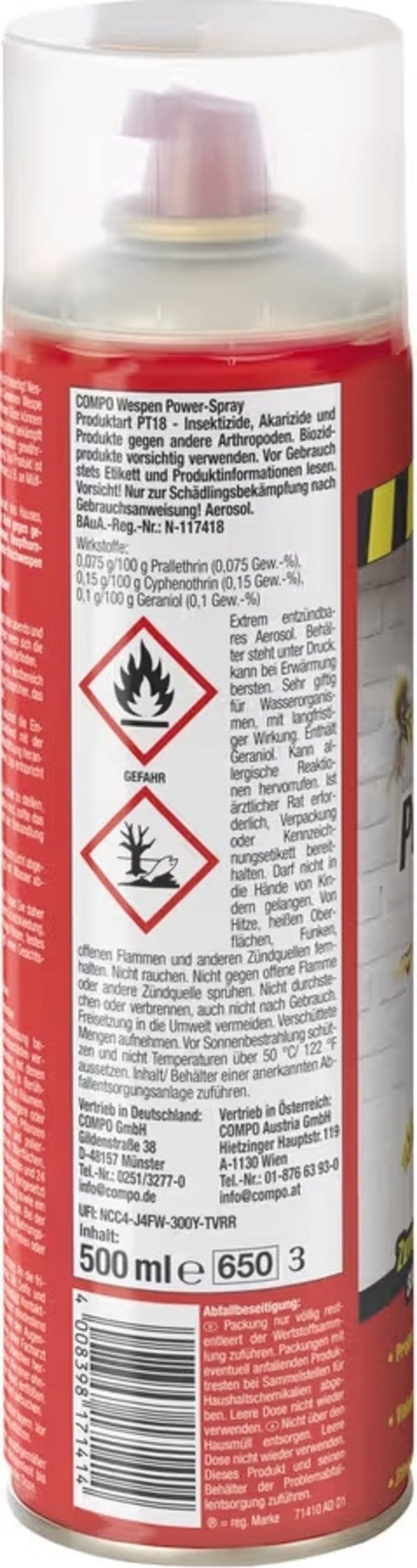 Con el spray potente contra avispas de COMPO, combatirás rápidamente a las molestas avispas. Gracias a su potente boquilla, puedes combatir nidos y avispas individuales desde una distancia segura, sin necesidad de acercarte peligrosamente. La combinación especial de principios activos actúa de inmediato y garantiza una protección duradera. Ideal para el hogar, el jardín, la terraza o el balcón, para que vuelvas a disfrutar sin molestias.