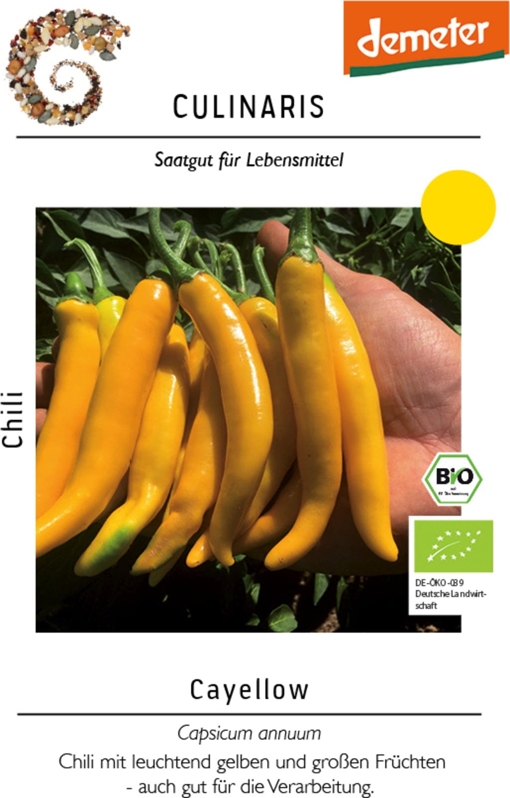 El chili „Cayellow“ produce frutos grandes de color amarillo brillante con un picor medio. Madura temprano y ofrece una cosecha abundante durante toda la temporada. Sus plantas sanas y el atractivo juego de colores lo convierten en un complemento ideal tanto visual como culinario para el jardín, el balcón o la maceta.