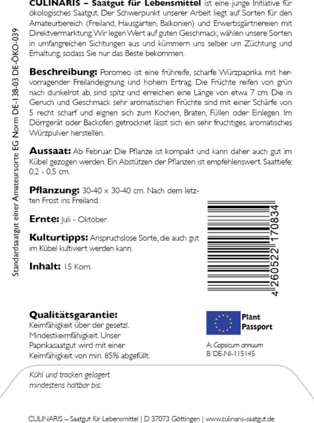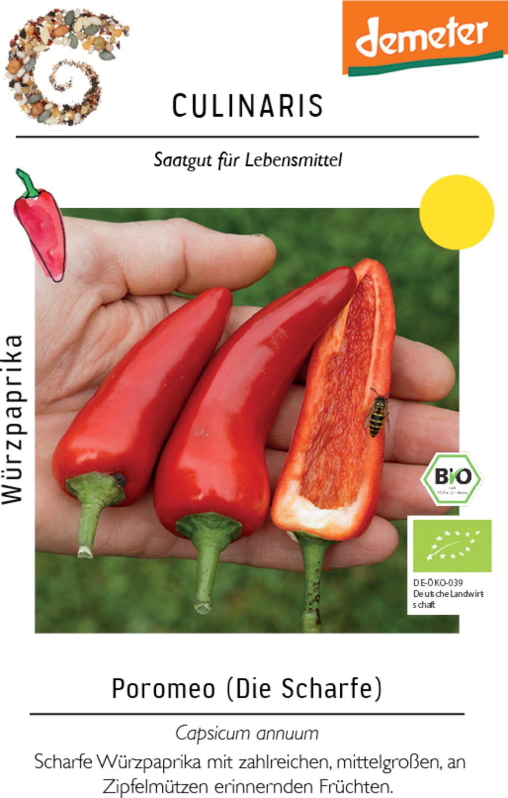 El pimiento para condimentar «Poromeo» produce frutos puntiagudos y aromáticos con un picante medio. Es de maduración temprana, productivo y muy versátil: ya sea fresco en platos, encurtido o seco como especia. Gracias a su crecimiento compacto, también es adecuado para el cultivo en macetas.