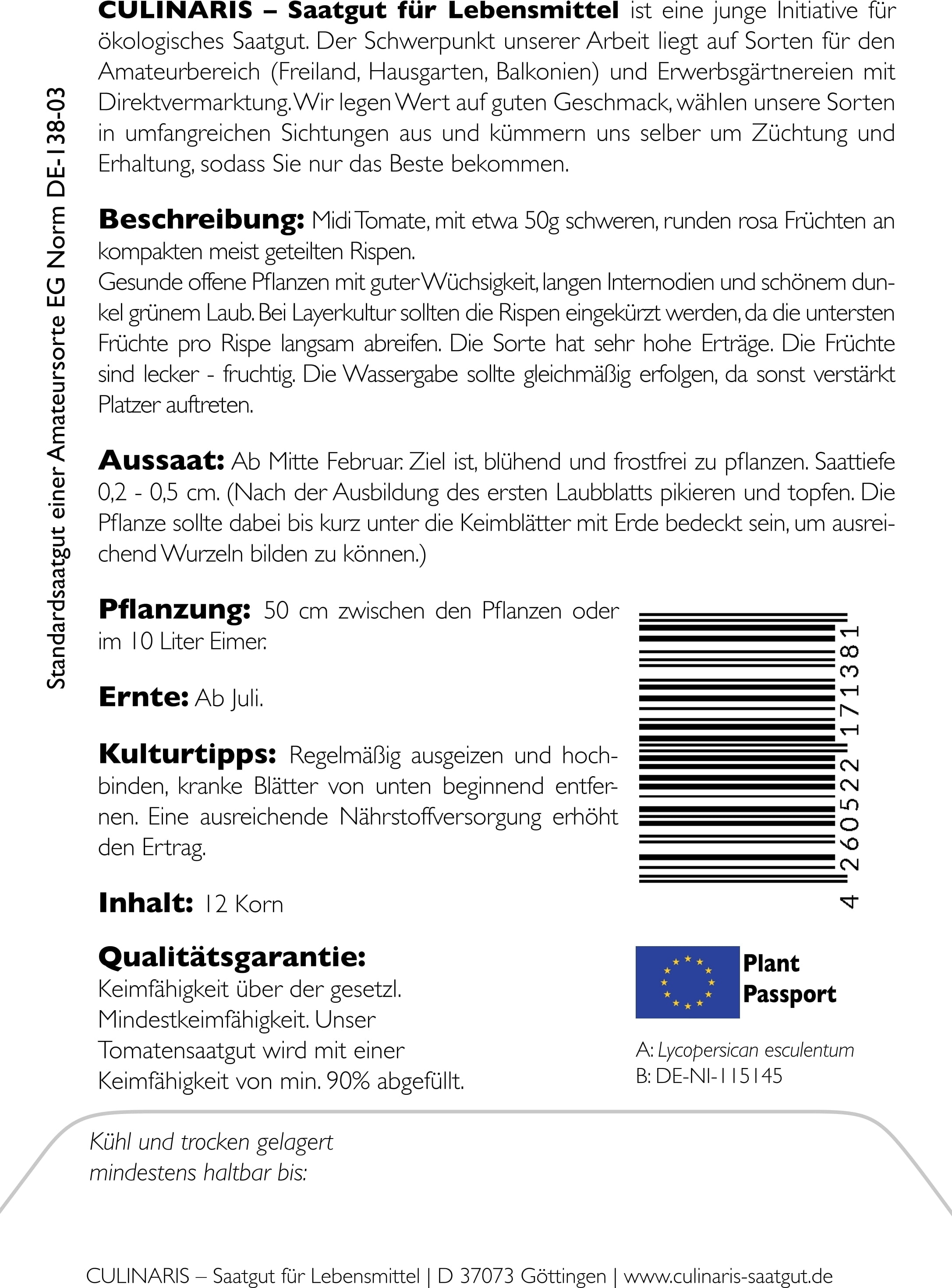 | Fabricante: | Culinaris - Saatgut für Lebensmittel, Thiegasse 5, 37124, Rosdorf, Alemania, info@culinaris-saatgut.de, culinaris-saatgut.de |