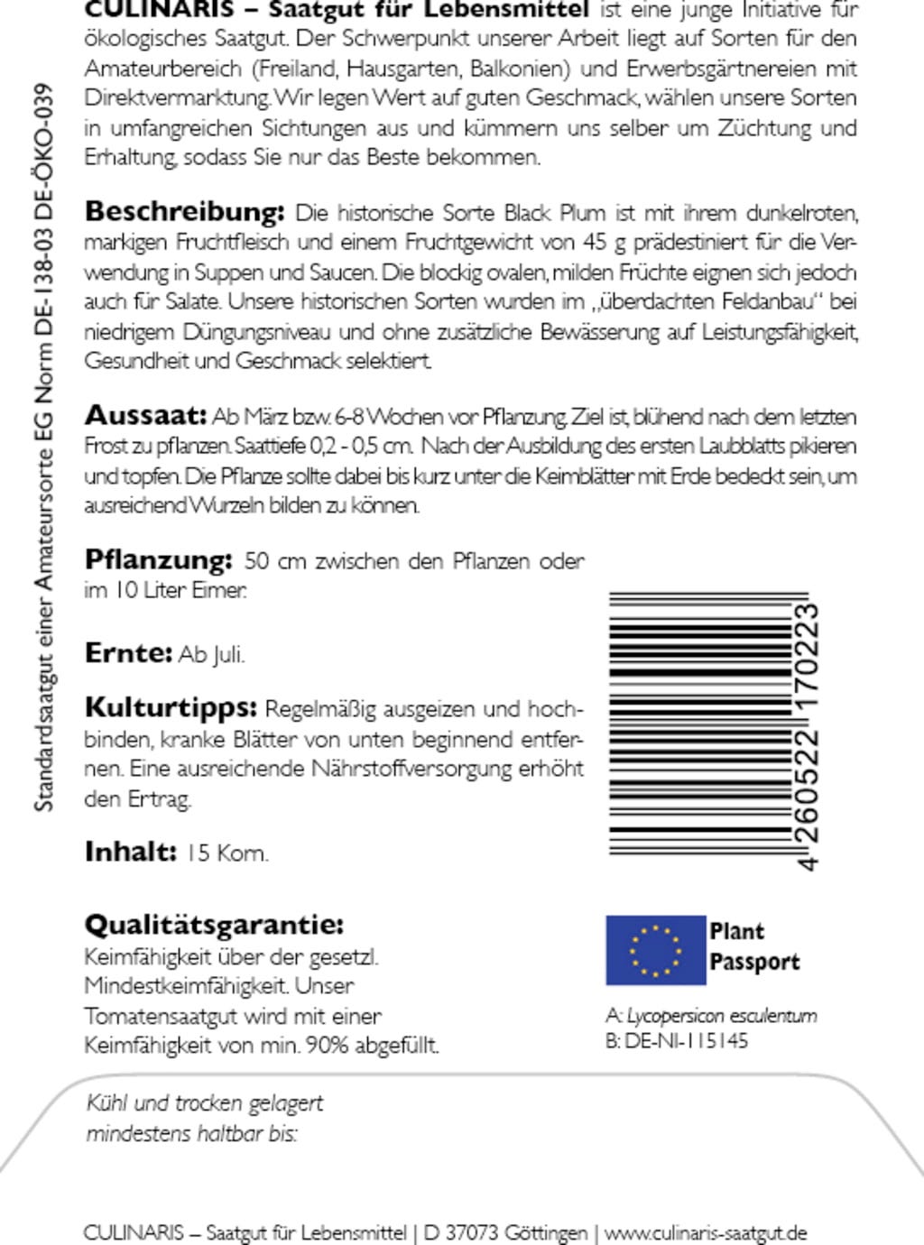 | Fabricante: | Culinaris - Saatgut für Lebensmittel, Thiegasse 5, 37124, Rosdorf, Alemania, info@culinaris-saatgut.de, culinaris-saatgut.de |