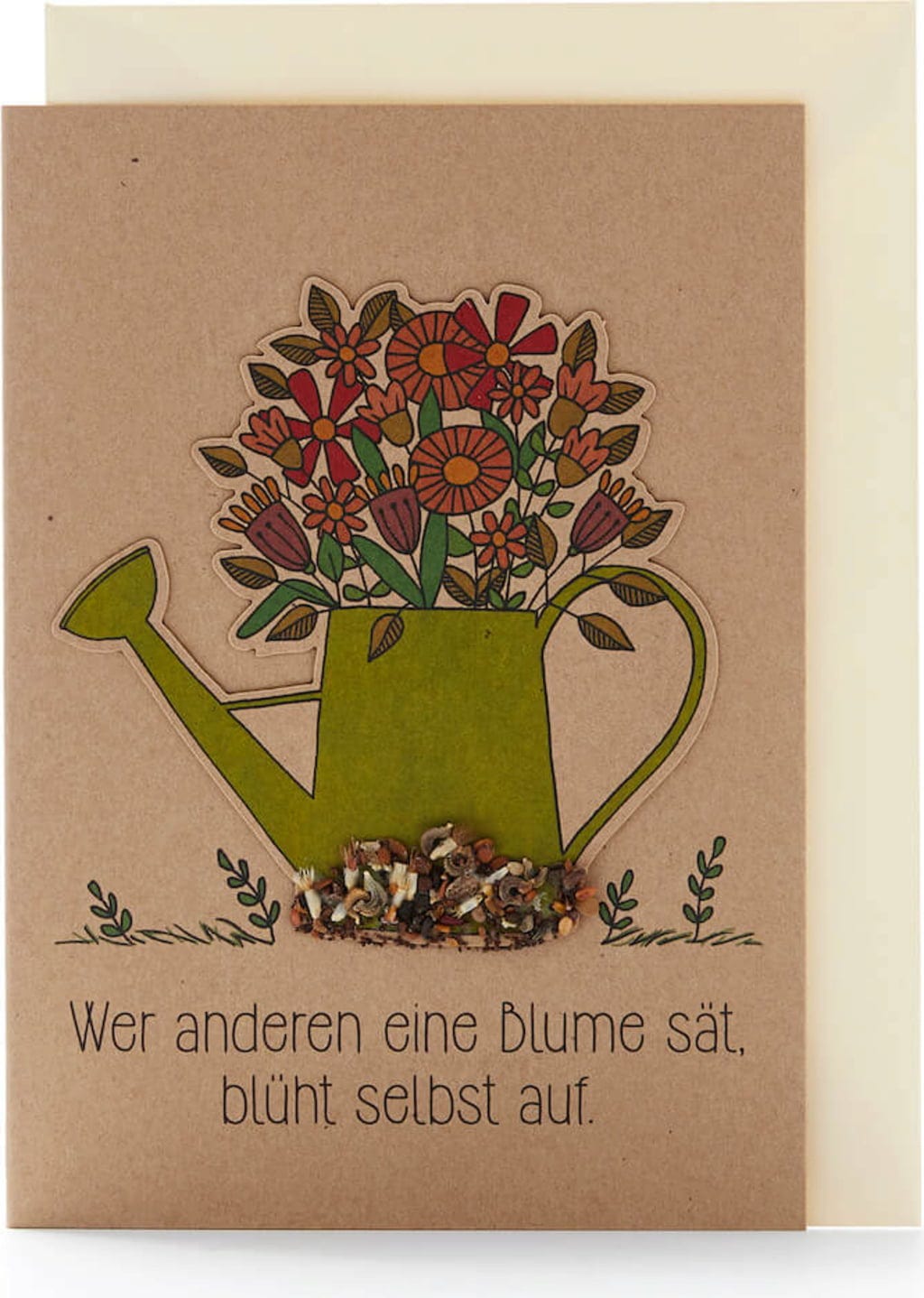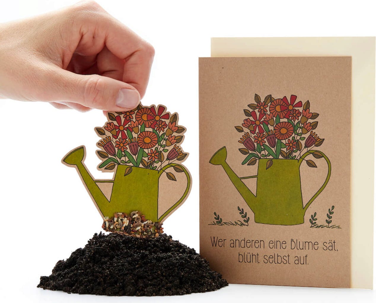 ¿Qué tiene de especial? ¡La regadera de la tarjeta está llena de semillas! Quien la reciba podrá despegarla del papel y plantarla. Con el tiempo y los cuidados adecuados, crecerán muchas flores silvestres preciosas.