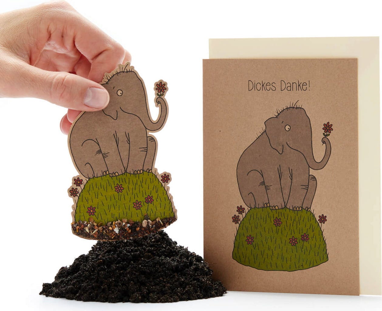 Dado que el elefante también está impreso en el papel, el motivo permanece incluso después de que las semillas se hayan retirado para plantarlas.