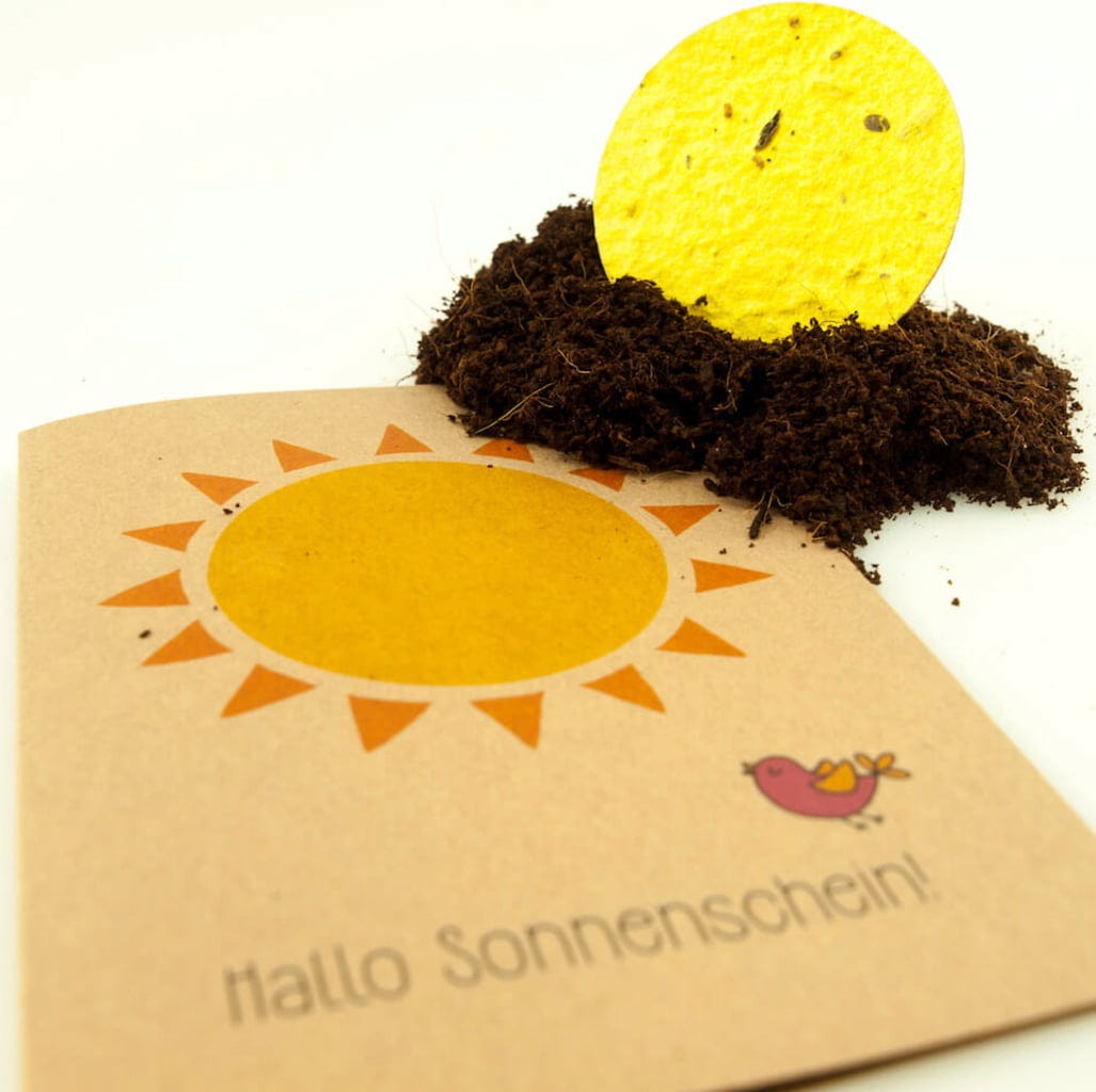 Dado que el sol también está impreso en el papel, el motivo permanece incluso después de que las semillas se hayan retirado para ser plantadas.