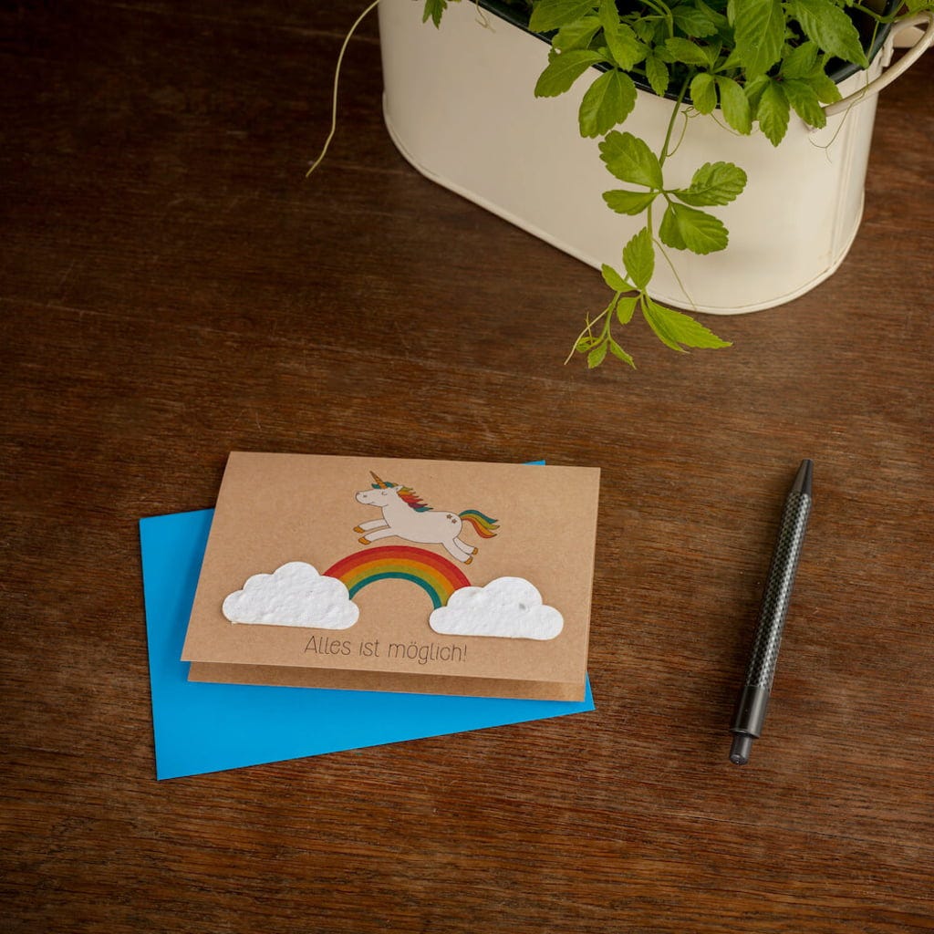 Esta tarjeta es el regalo perfecto para quien necesita un poco de motivación y confianza en sí mismo. Aunque a veces el mundo pueda parecer gris y estrecho, depende de nosotros hacerlo más colorido y bonito con nuestra imaginación e ideas. Esta tarjeta es perfecta para transmitir este mensaje y, gracias a las semillas de flores silvestres escondidas entre las dos nubes, también hará que el mundo en el que vivimos sea un poco más colorido.