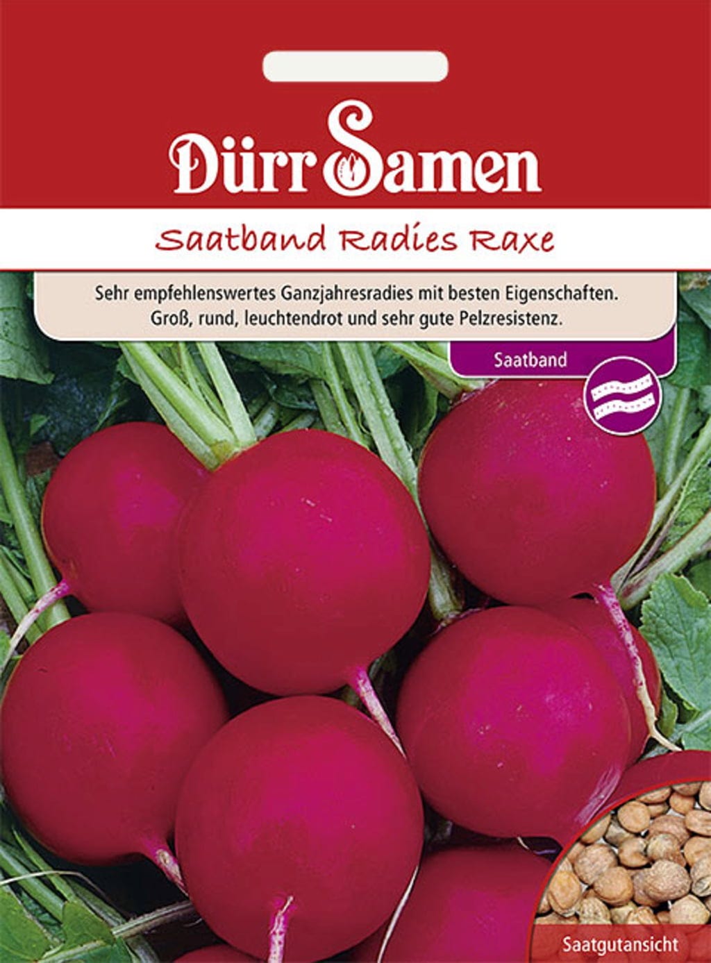 Esta variedad resistente forma rábanos rojos con un diámetro de hasta 6 cm. Gracias a la cinta de semillas, sembrar es fácil y rápido.