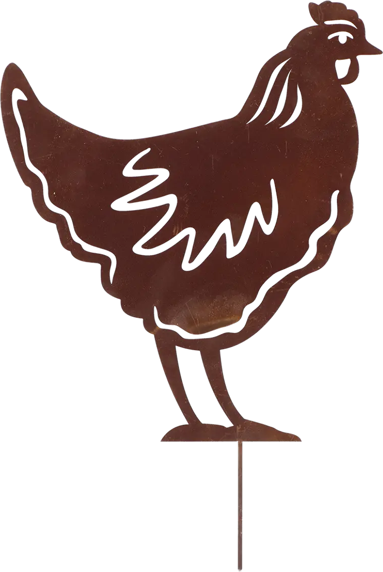 Una decoración para jardín finamente cortada con láser en forma de gallina, ideal para embellecer parterres cuidados con amor y aportar un toque lúdico incluso a las macetas.