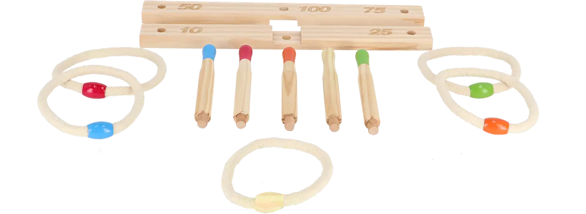 Este clásico juego de habilidad garantiza diversión en el jardín y es un éxito no solo en las fiestas de cumpleaños. ¿Quién conseguirá colocar los aros en los diferentes palos?
