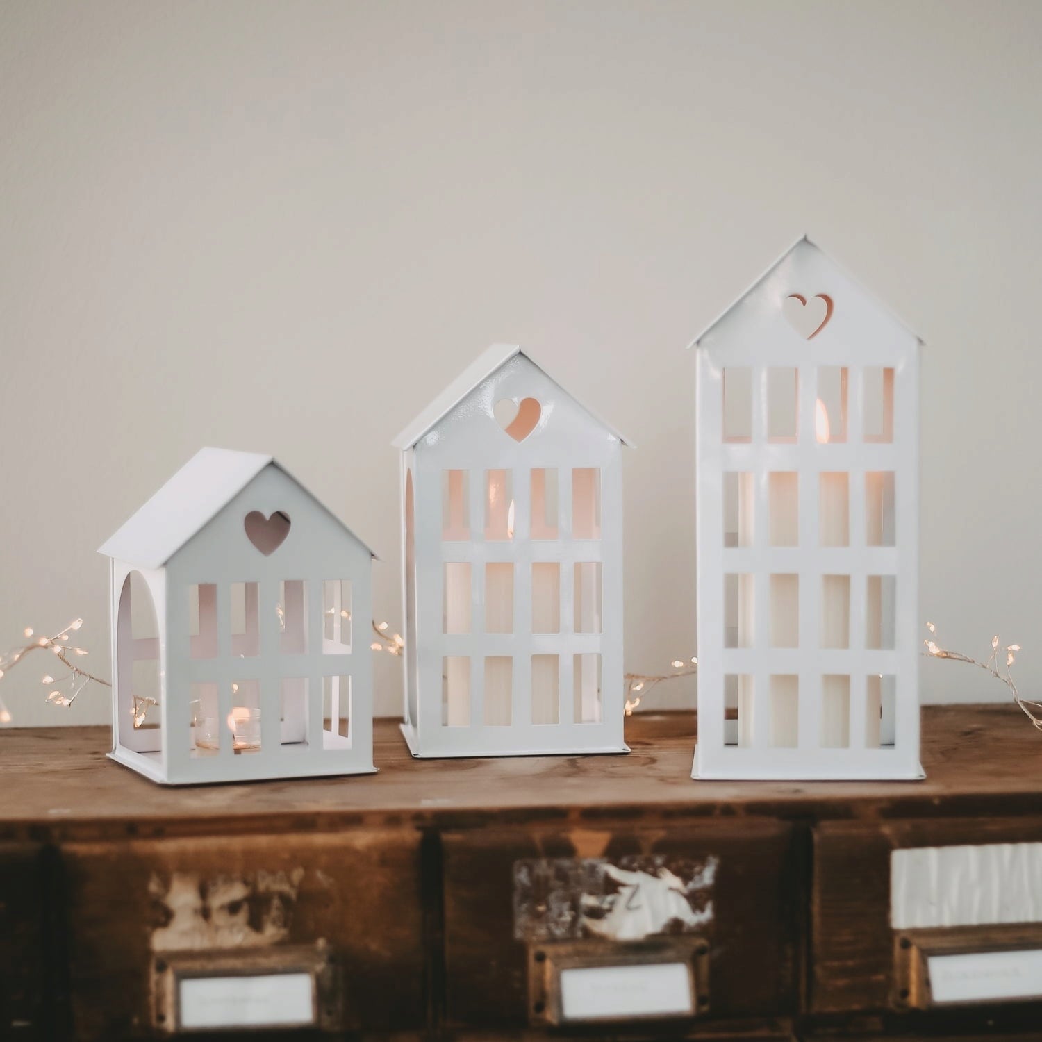 La pequeña casita metálica blanca aporta a cualquier ambiente un toque elegante y atemporal, ofreciendo infinitas posibilidades de decoración personalizada. Se puede realzar con una delicada guirnalda luminosa, convertir en un sugerente punto focal con una vela o simplemente dejarla al natural: en cualquier versión, llama inmediatamente la atención.