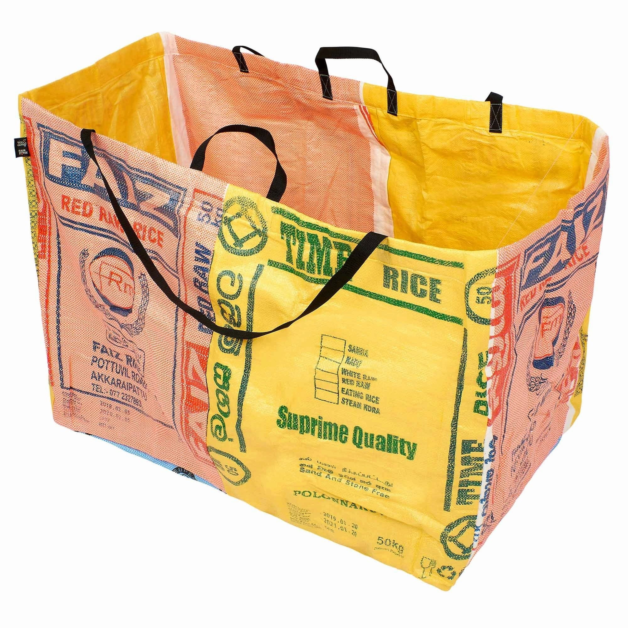 - Fabricado con sacos de arroz reciclados: cada pieza es única