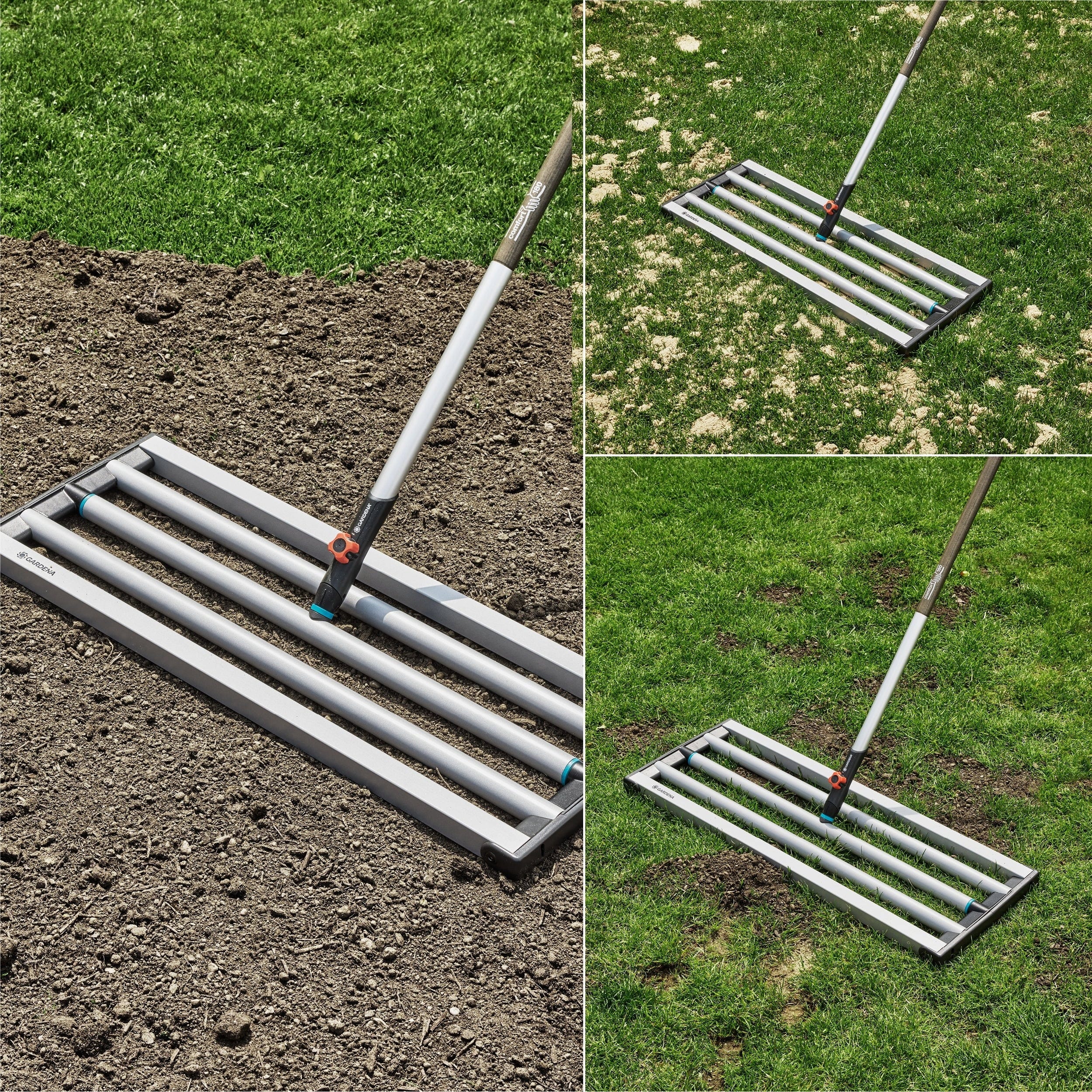 Olvídate de tener que nivelar a mano: con el rastrillo para césped combisystem GARDENA podrás distribuir la tierra, la arena o el recebo de forma rápida y uniforme, como hacen los profesionales en los campos de golf. Gracias a la gran anchura de trabajo de 76 cm, incluso las superficies más grandes se pueden nivelar en un abrir y cerrar de ojos, ya sea para rectificar desniveles después de escarificar o para preparar un césped nuevo. Las placas interiores y las esquinas especialmente redondeadas permiten que la herramienta se deslice fácilmente sobre el suelo, evitando que se acumule tierra húmeda o que se dañen las delicadas briznas de hierba. De este modo se consigue una superficie perfectamente uniforme con el mínimo esfuerzo, creando la base ideal para un crecimiento sano.