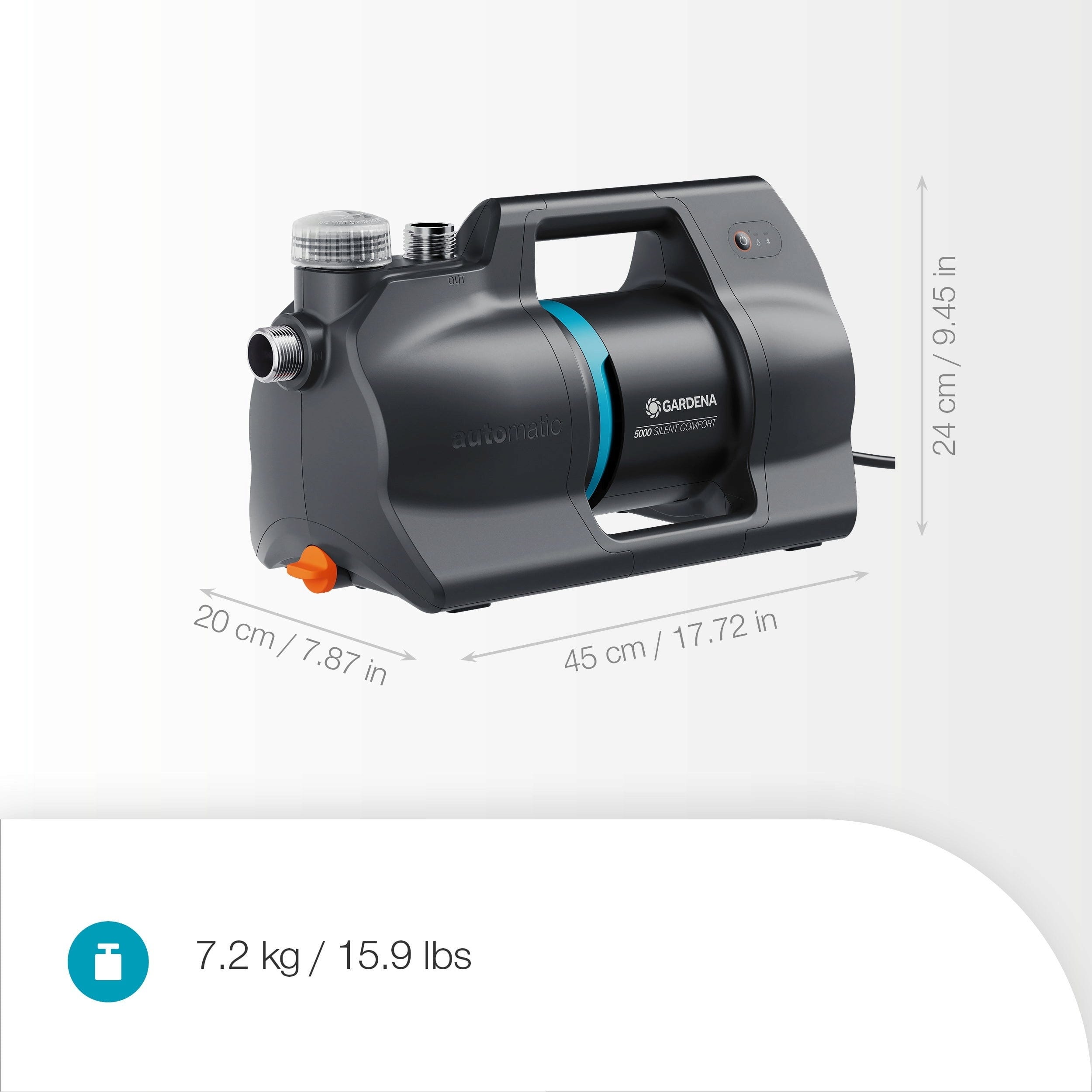 - Protección integral: construcción resistente a la intemperie con filtro integrado y protección contra funcionamiento en seco.