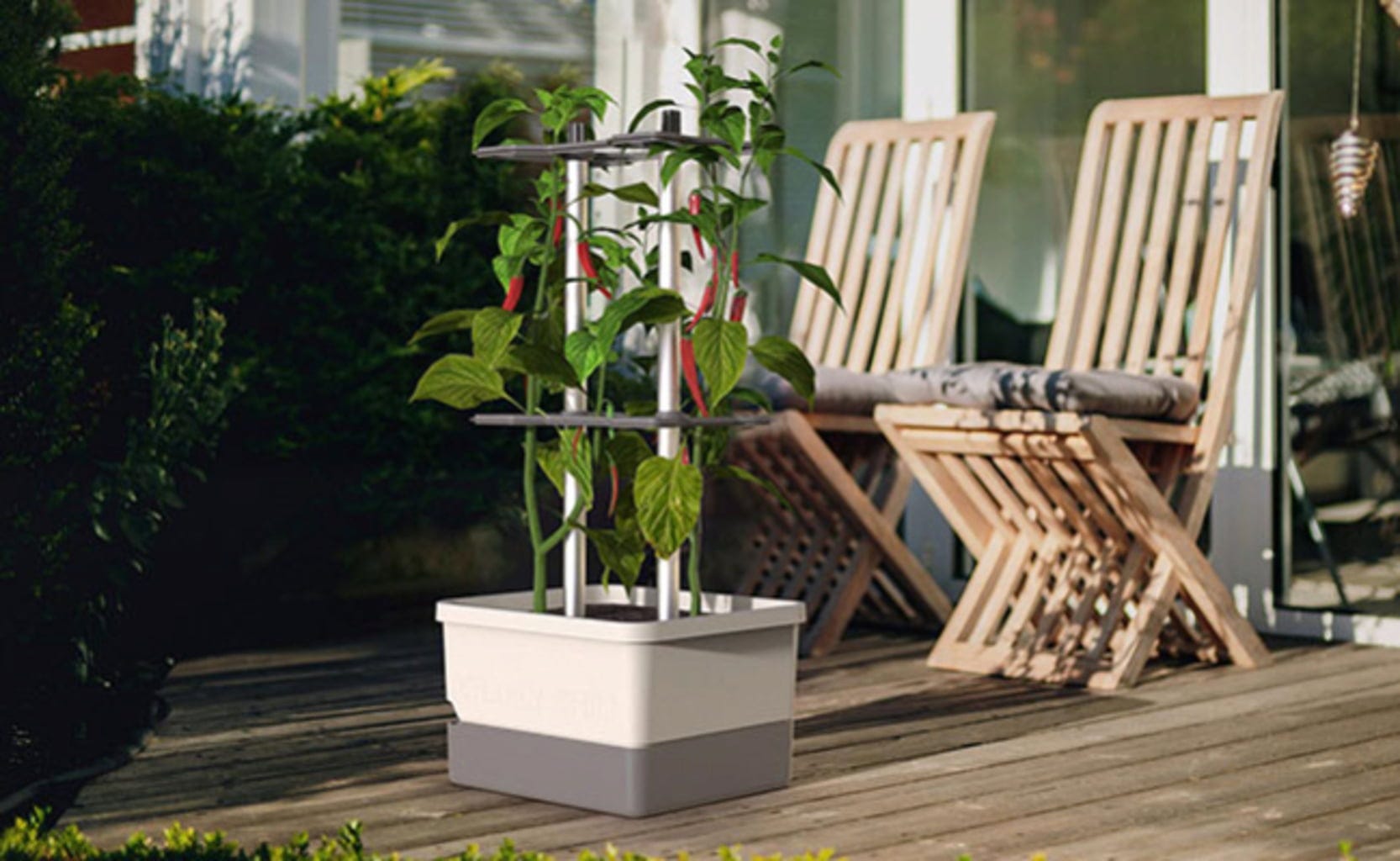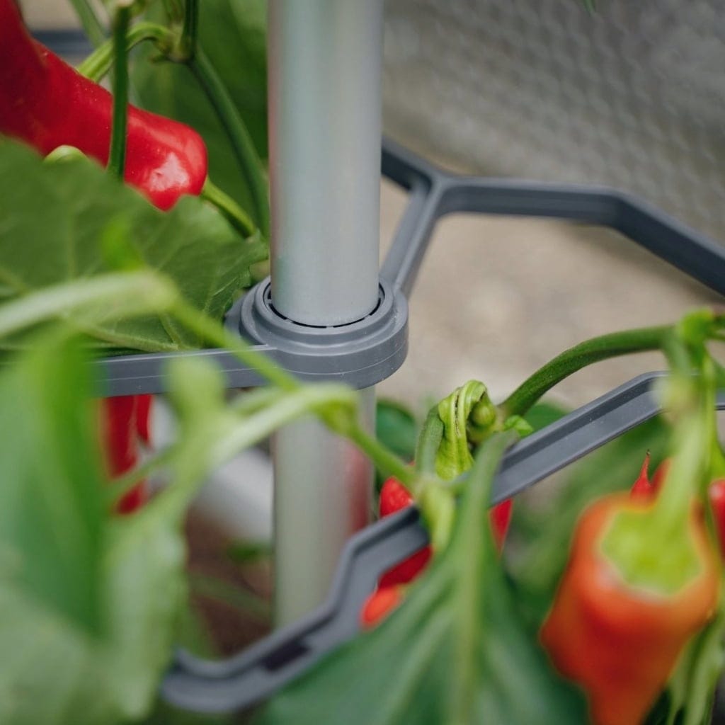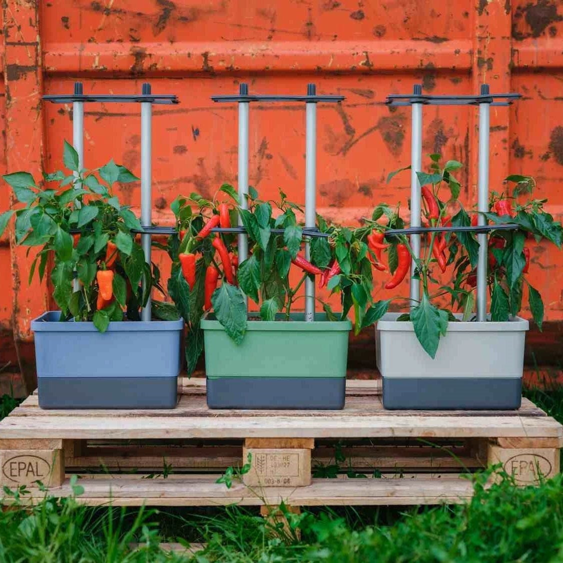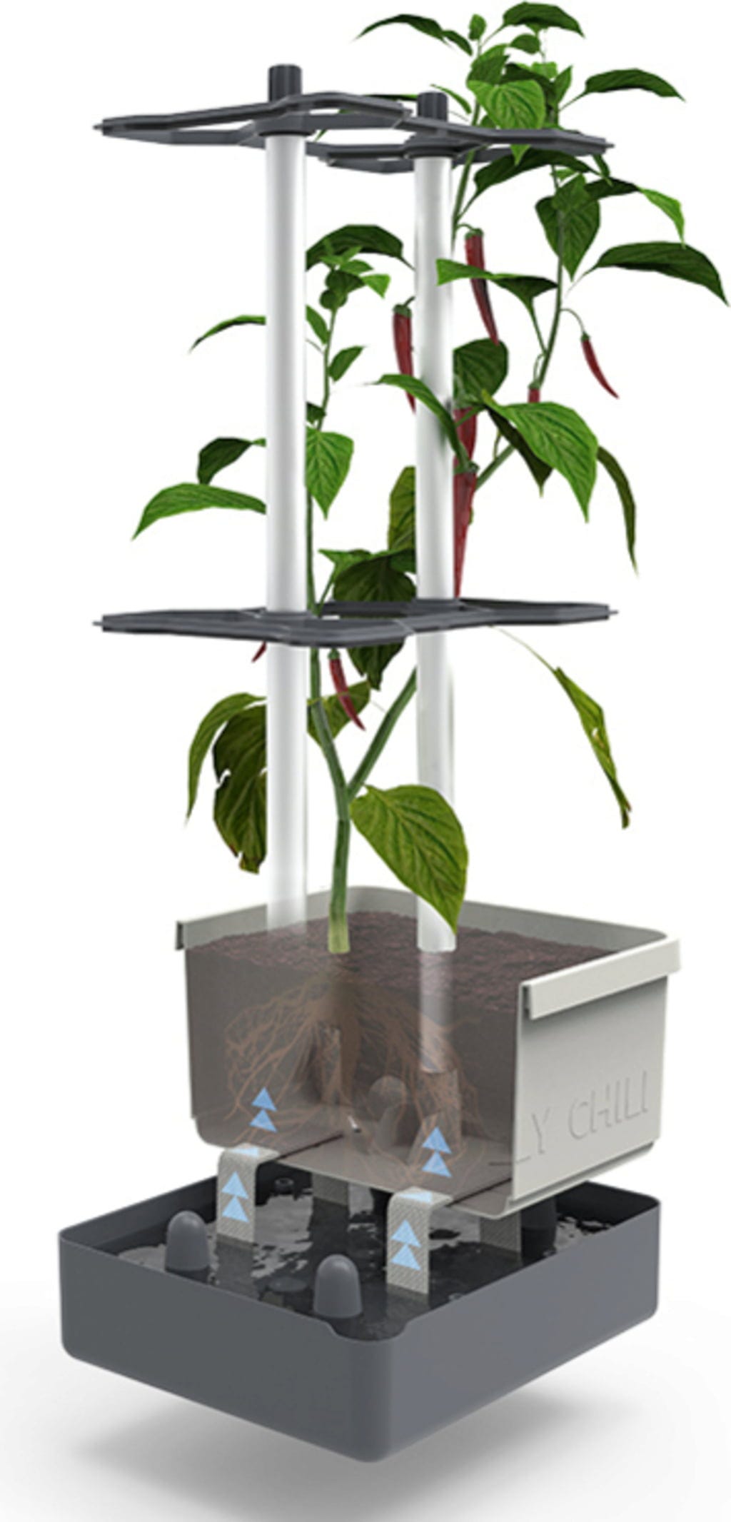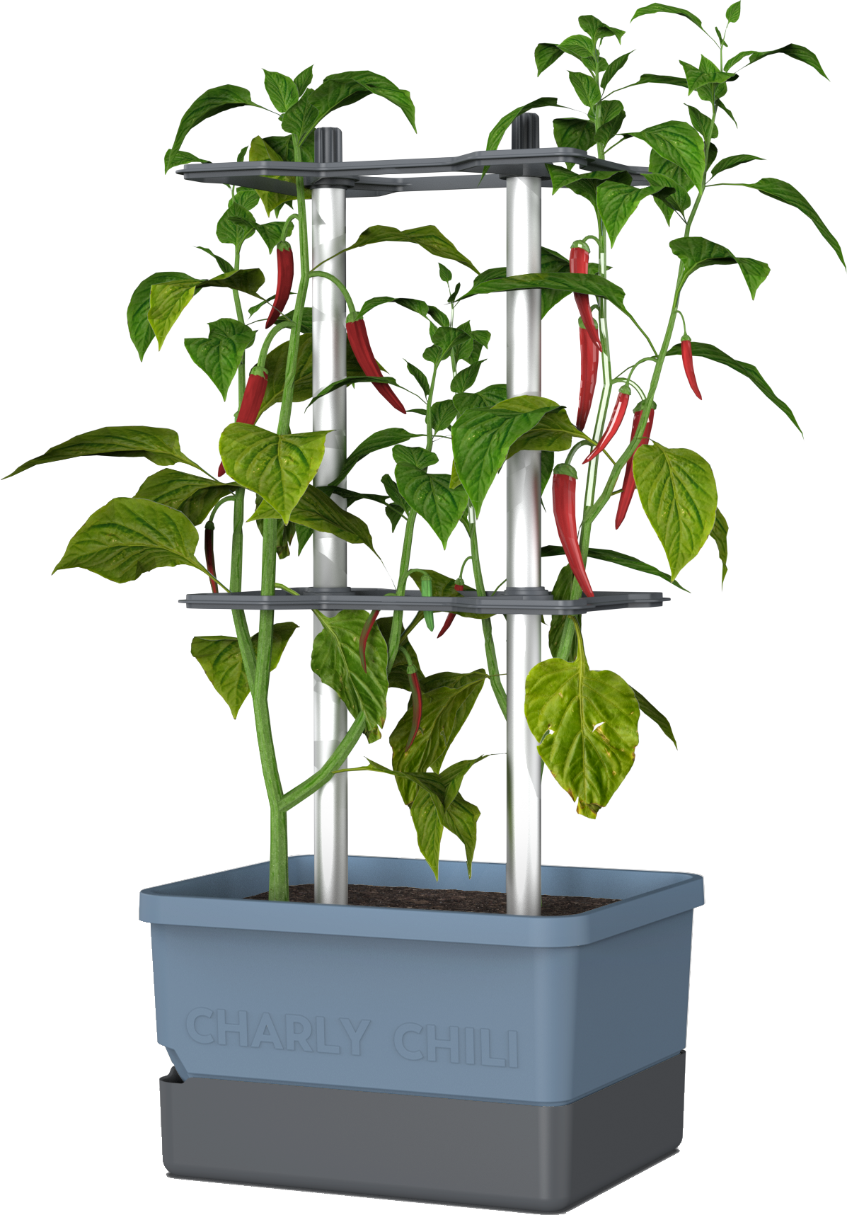 Con CHARLY CHILI, plantar y cultivar pimientos y guindillas será un juego de niños Con un soporte de aluminio diseñado para plantas trepadoras, la maceta cuenta con un práctico depósito de agua integrado. Sólo necesita 10 litros de sustrato y dos plantas de pimiento picante... ¿a qué espera?