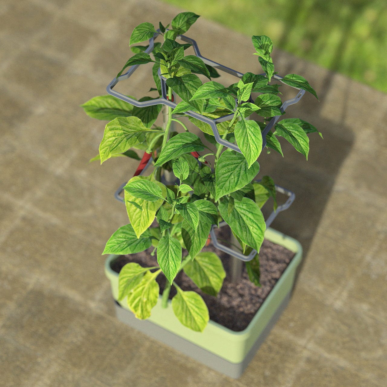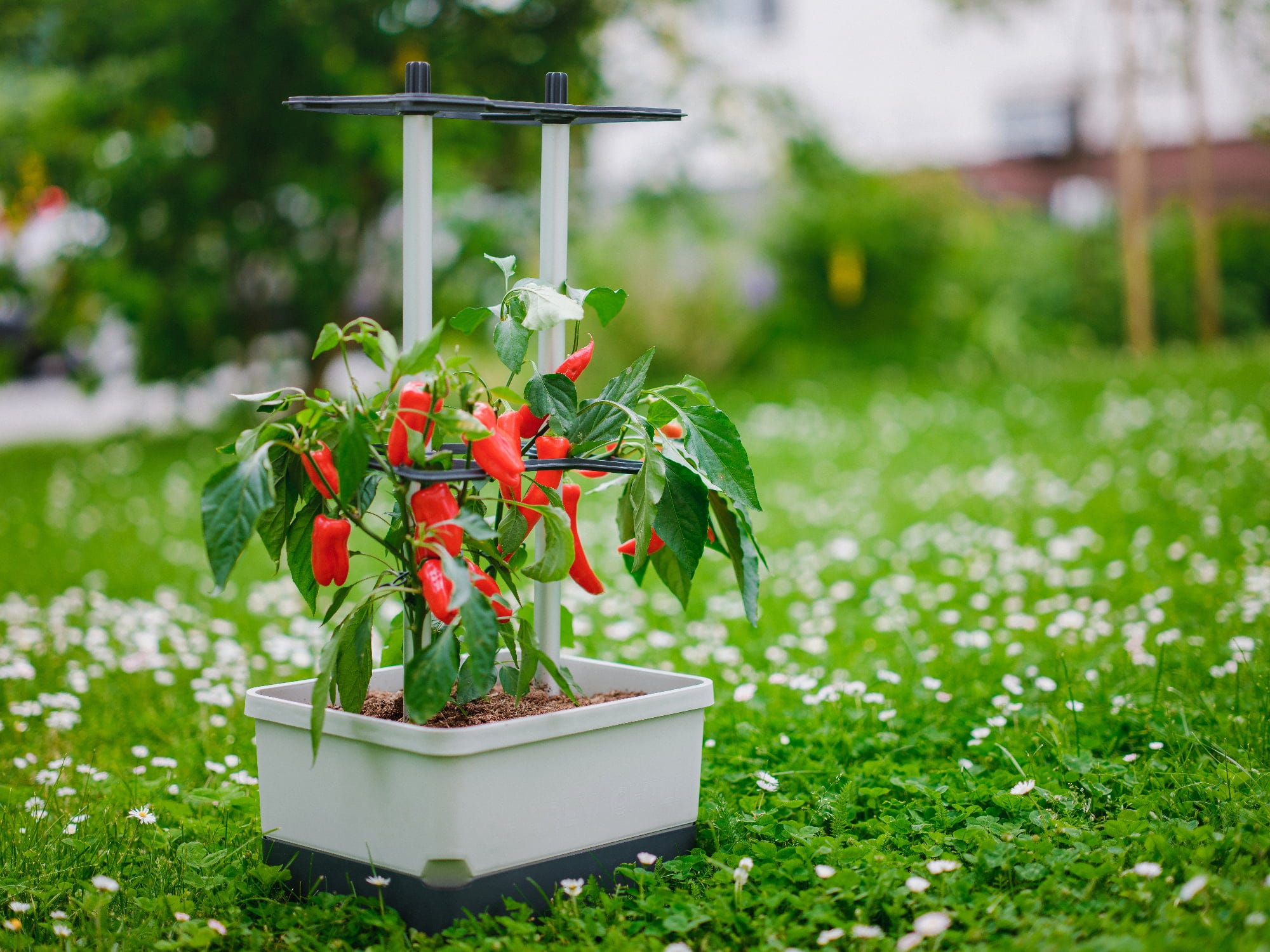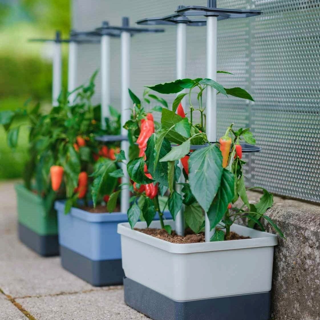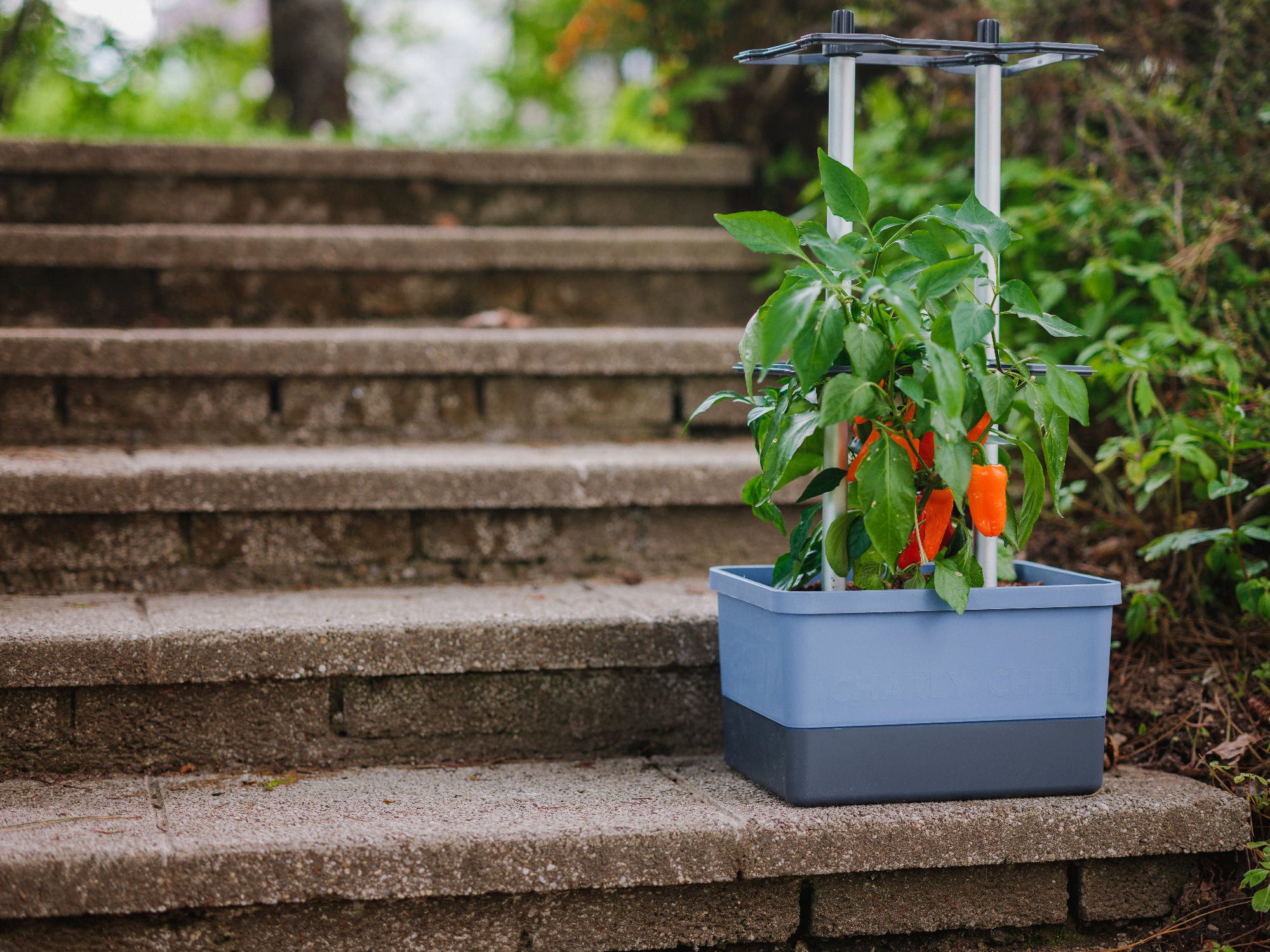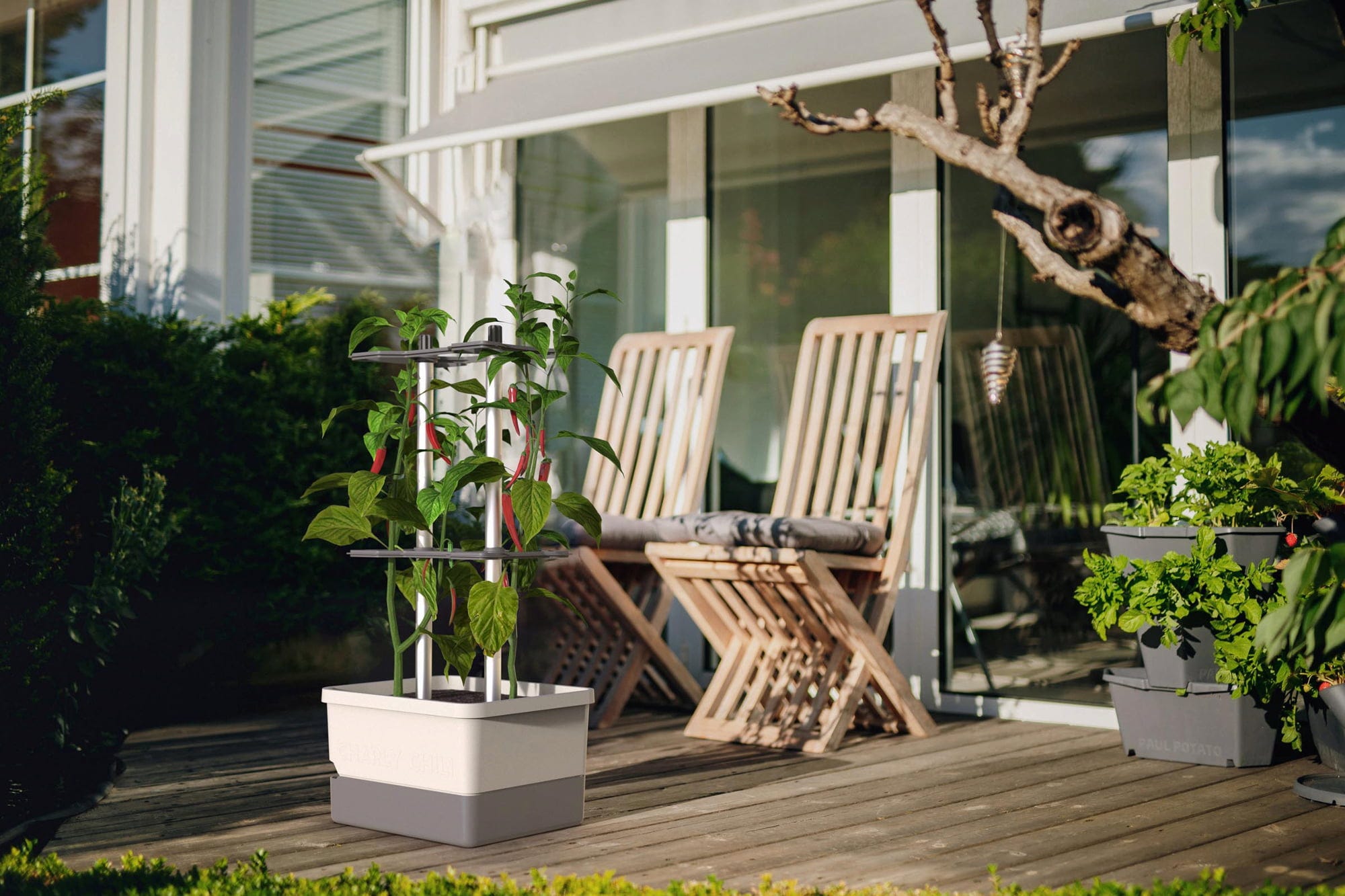 Con CHARLY CHILI, plantar y cultivar pimientos y guindillas será un juego de niños Con un soporte de aluminio diseñado para plantas trepadoras, la maceta cuenta con un práctico depósito de agua integrado. Sólo necesita 10 litros de sustrato y dos plantas de pimiento picante... ¿a qué espera?
