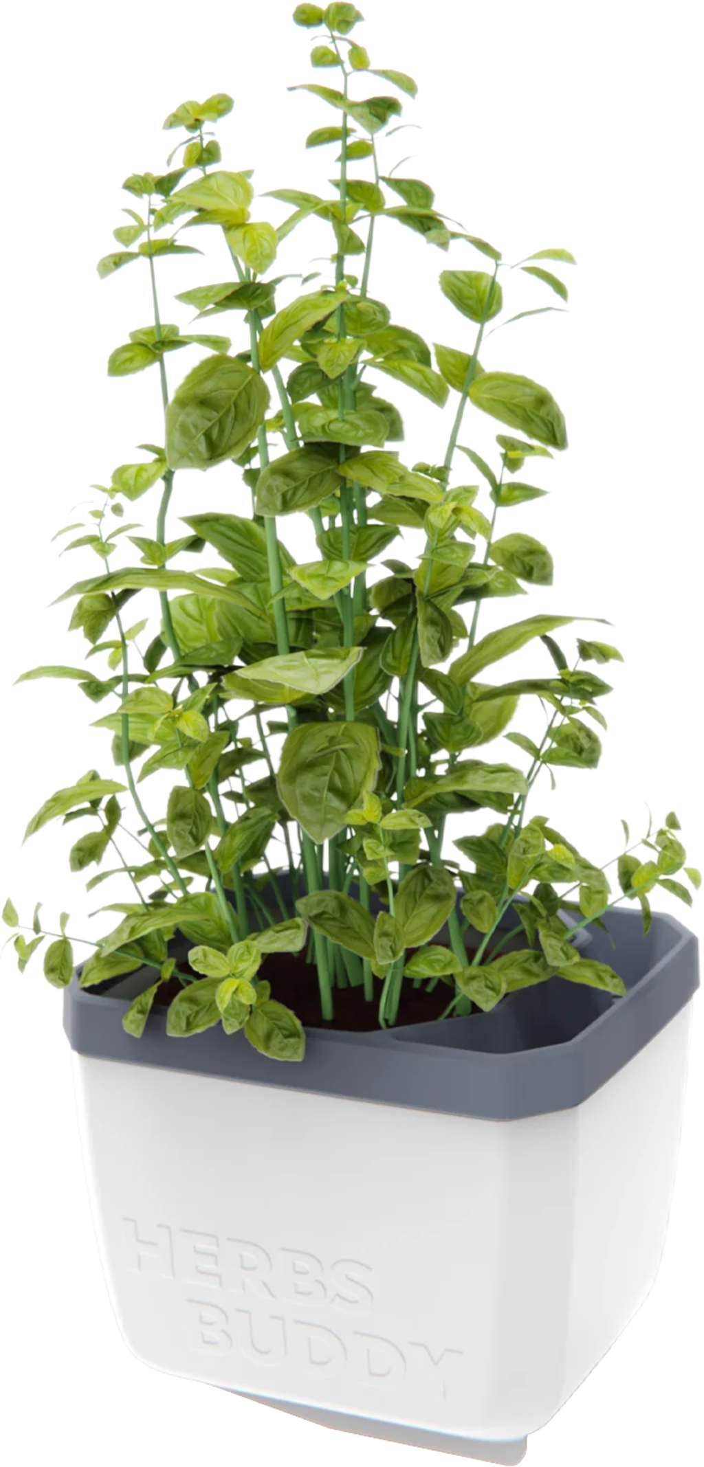 ¡Inteligente, más inteligente, HERBS BUDDY! Este práctico macetero está especialmente diseñado para cultivar hierbas en casa. ¿Por qué es tan inteligente? Cuando el suministro de agua del depósito integrado se está agotando, HERBS BUDDY se inclina hacia un lado, indicando inequívocamente que es hora de regar las plantas. Muy práctico