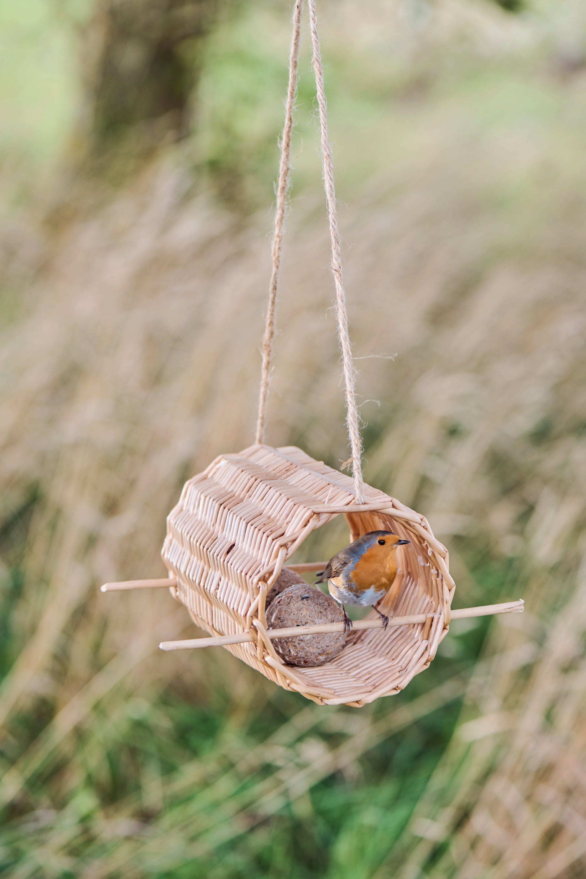 Comedero para pájaros de mimbre natural, perfecto para ofrecer a las aves un lugar protegido donde alimentarse y añadir al jardín un elemento decorativo con un encanto auténtico.