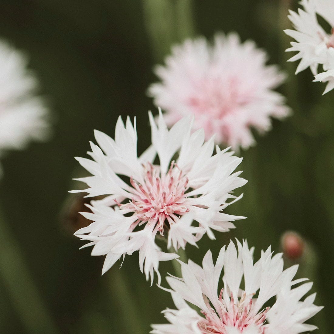 Esta variedad de aciano muestra su lado más romántico con delicados tonos rosados y blancos. Con sus tallos largos y múltiples ramificaciones, es la flor de corte ideal.