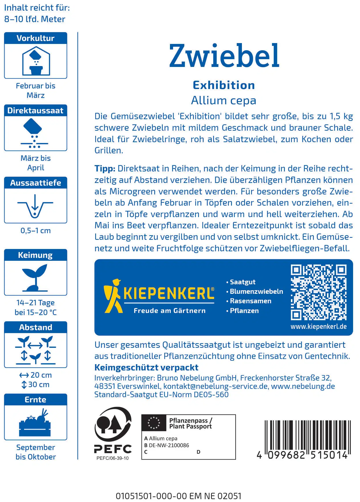 La cebolla gigante «Exhibition» destaca por su impresionante tamaño: los bulbos individuales pueden llegar a pesar hasta 1,5 kg. Su sabor suave y su piel marrón la hacen muy versátil: ideal para ensaladas, cocinar, asar a la parrilla o como aros de cebolla. Esta variedad tiene una buena capacidad de almacenamiento, por lo que podrás disfrutar de las cebollas recién cosechadas durante mucho tiempo.