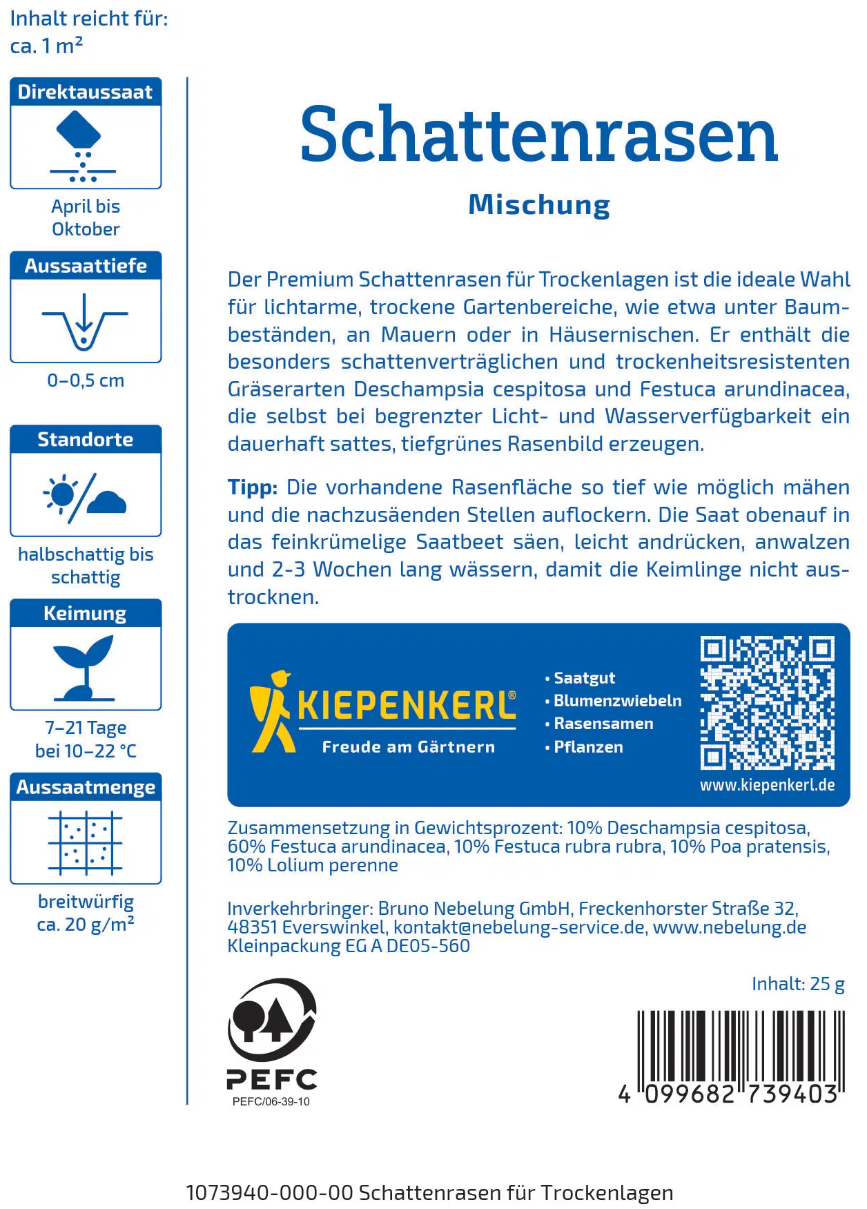 El césped de sombra premium de Kiepenkerl Profi-Line ha sido desarrollado especialmente para zonas de jardín con poca luz y secas, por ejemplo, bajo los árboles o junto a los muros. Las gramíneas resistentes a la sombra y a la sequía garantizan un césped denso y de color verde intenso, desplazan el musgo y las malas hierbas y son especialmente fáciles de cuidar. Ideal para jardines domésticos, zonas de descanso y áreas de juego: basta con sembrar, presionar ligeramente y disfrutar de una superficie de césped sana y resistente.