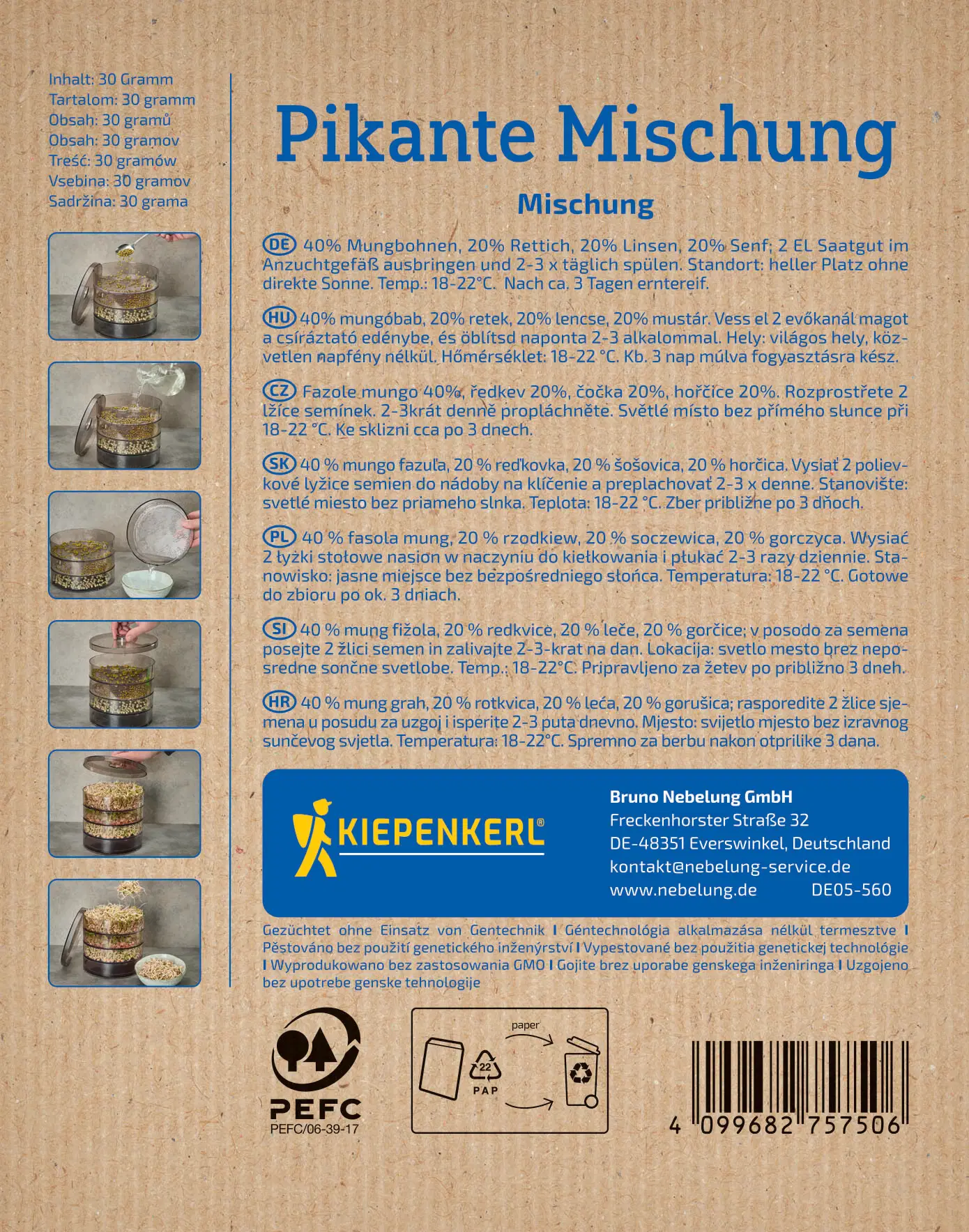 La mezcla picante de alfalfa, judías mungo y mostaza proporciona brotes aromáticos y crujientes. Perfectos para ensaladas, sándwiches o como guarnición creativa. Fáciles de cultivar en la caja de germinación de Kiepenkerl y listos para disfrutar frescos después de 3 a 7 días.