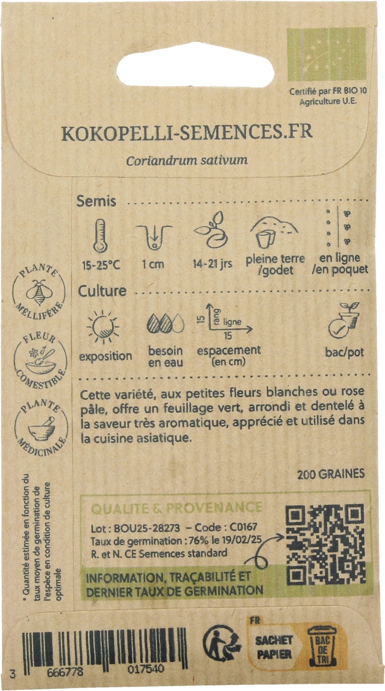El cilantro se distingue por su intenso aroma y sus múltiples usos culinarios. Las hojas jóvenes son perfectas para platos frescos, mientras que las semillas ofrecen propiedades aromáticas y beneficiosas. Una planta preciosa y fragante, ideal para el huerto, el balcón o el cultivo en maceta.