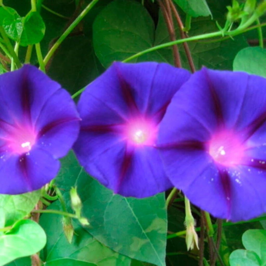 La antigua variedad Grandpa Ott cautiva con sus flores azul oscuro, cruzadas por una estrella roja, y crece vigorosamente hasta alcanzar los 5 metros de altura. Es ideal para cubrir cercas, enrejados o pérgolas, atrae abejas y produce abundantes semillas, que suelen reaparecer espontáneamente al año siguiente.