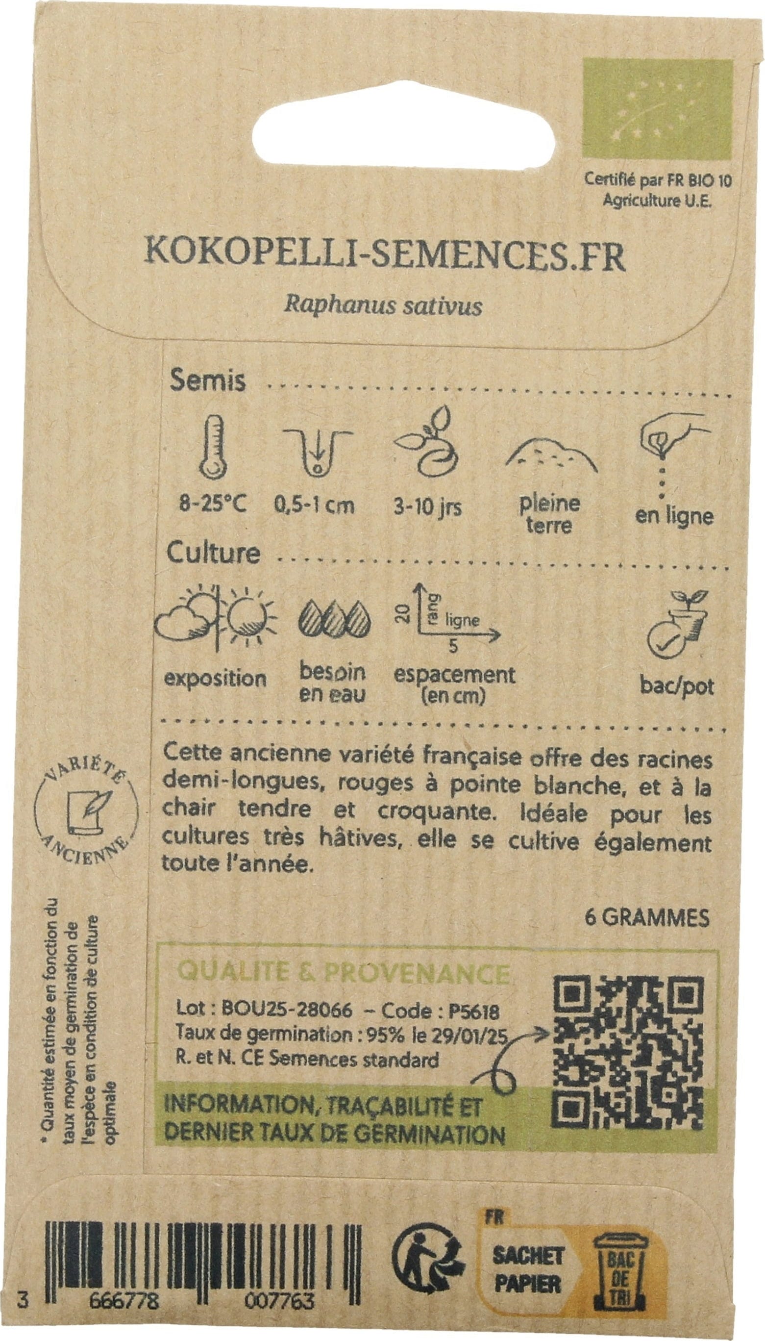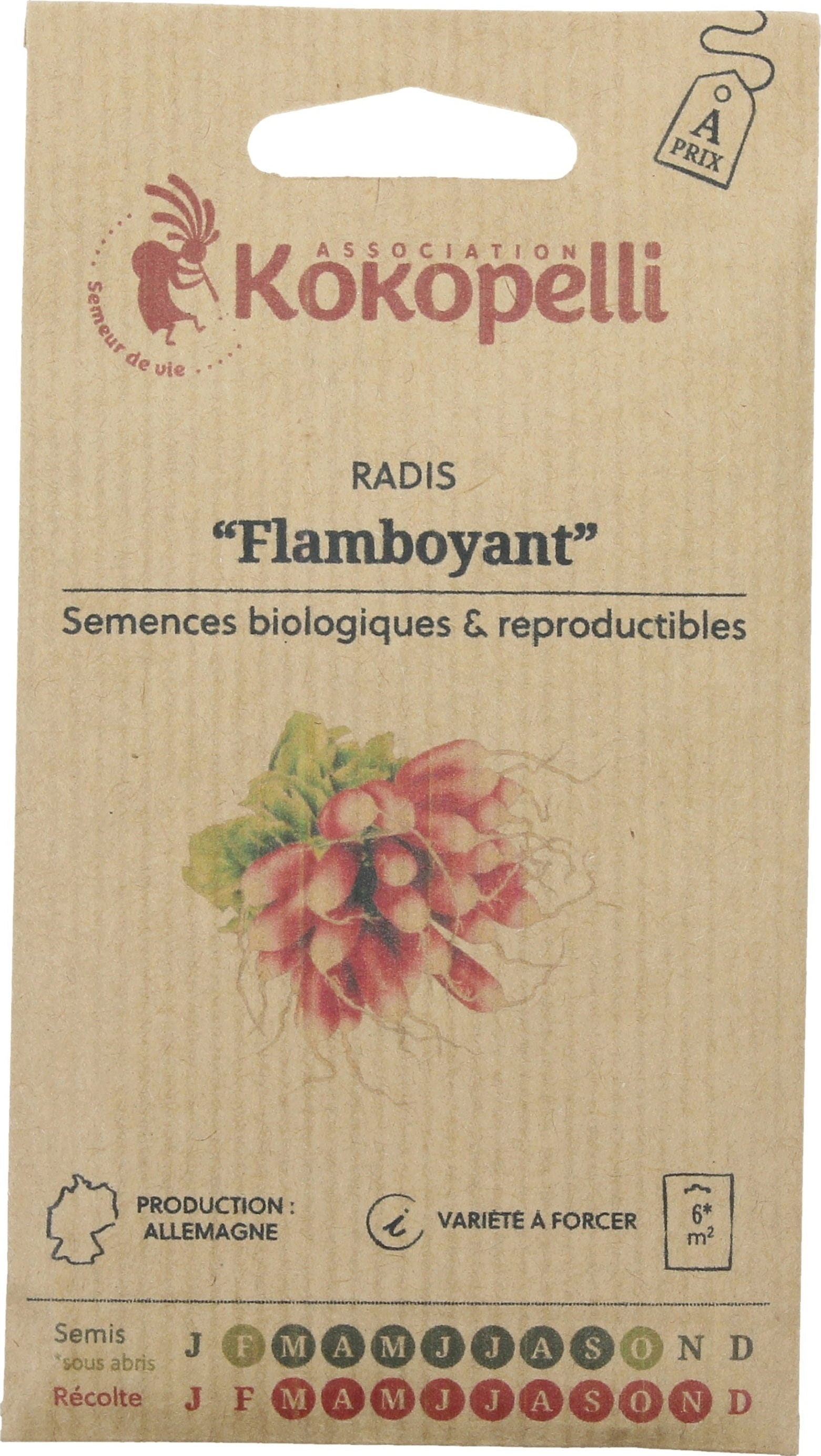 Esta antigua variedad francesa, también conocida como "Flamboyant", produce rábanos tiernos y crujientes con frutos rojos brillantes y puntas blancas. Es ideal para cosechas muy tempranas y se puede cultivar durante todo el año, dependiendo de la temporada. Perfecto para cosechas rápidas en el huerto o en maceta, aporta color y frescura a cualquier plato.