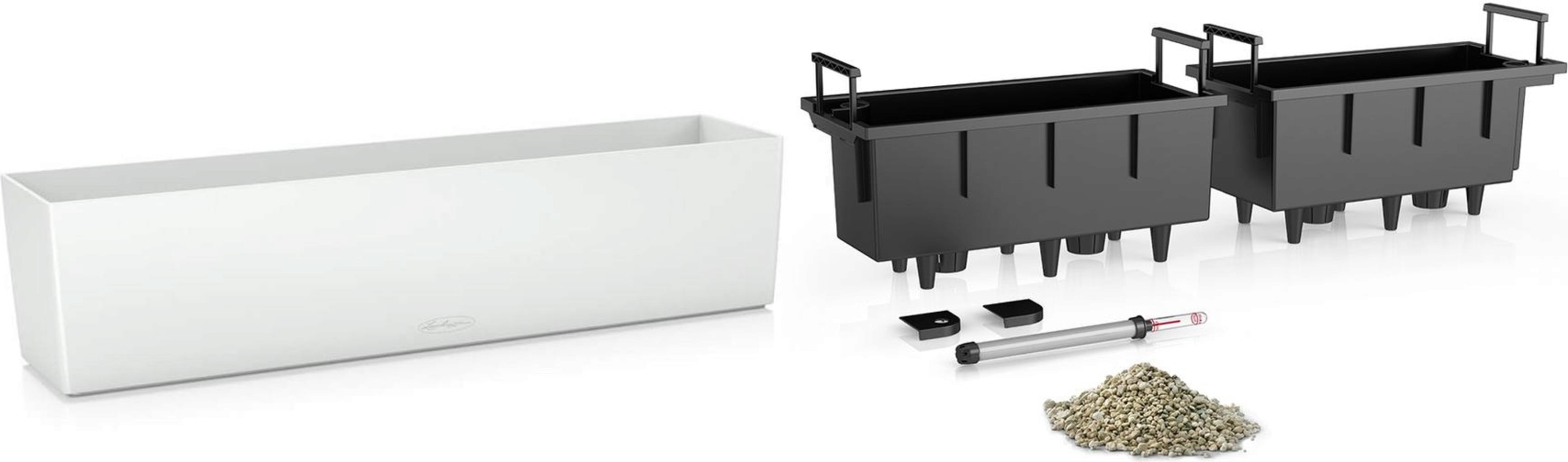 Se incluye: jardinera, 2 cubetas de plantación, indicador de nivel de agua, granulado
