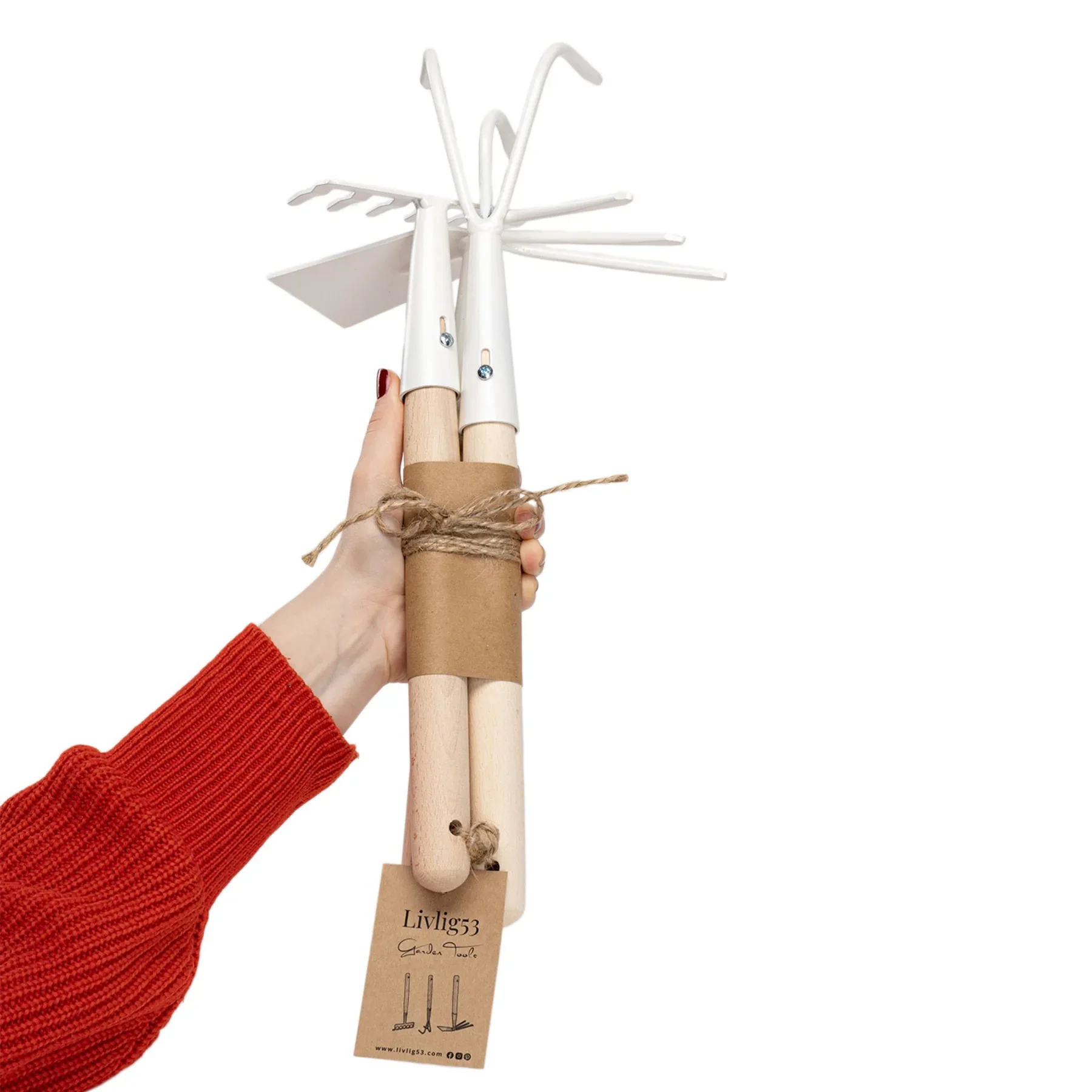 Perfecto para los amantes de la jardinería y la elegancia, este práctico set incluye un rastrillo, una escardadora y una azada. Las tres herramientas son perfectas para realizar las principales tareas del jardín, como sembrar, trasplantar y aflojar la tierra.