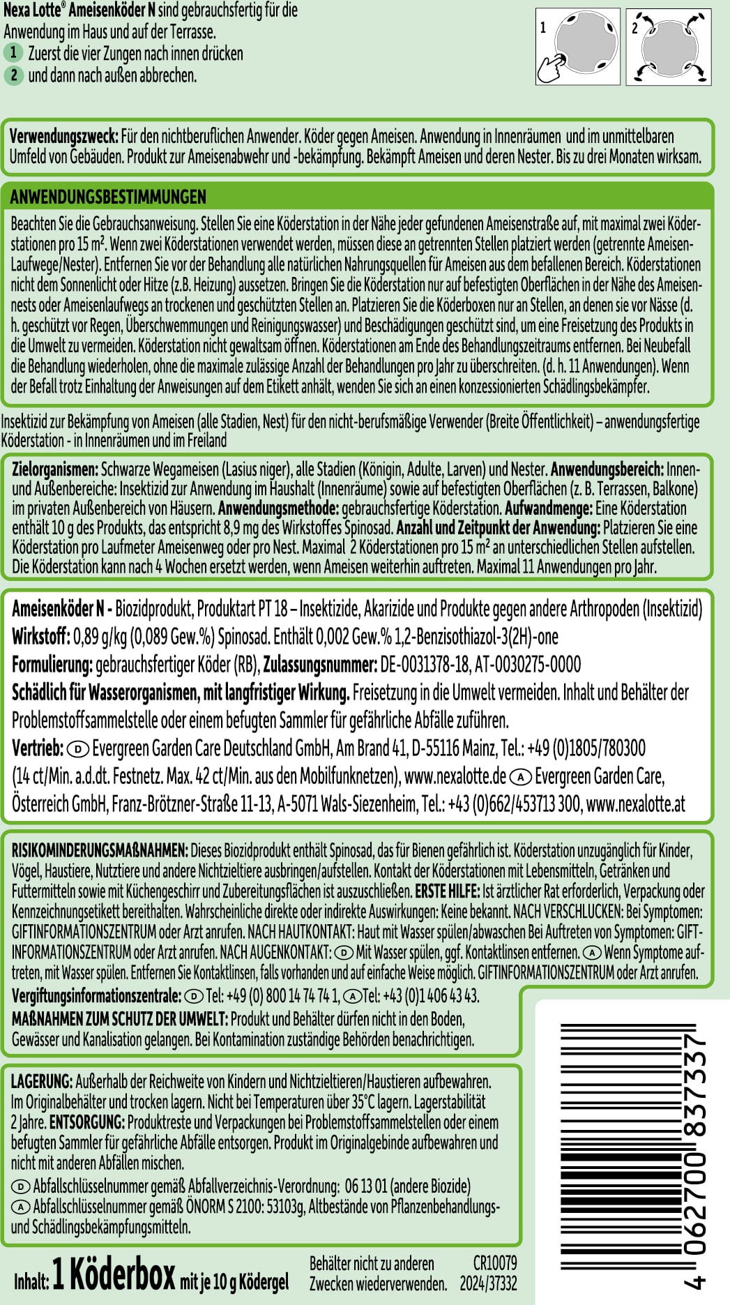 Este cebo para hormigas listo para usar puede utilizarse en el hogar y en la terraza. Las hormigas son atraídas al cebo a través de las aberturas de la caja. Allí, las hormigas cogen el gel cebo con el ingrediente activo, lo llevan a su nido y se lo dan a su cría.
