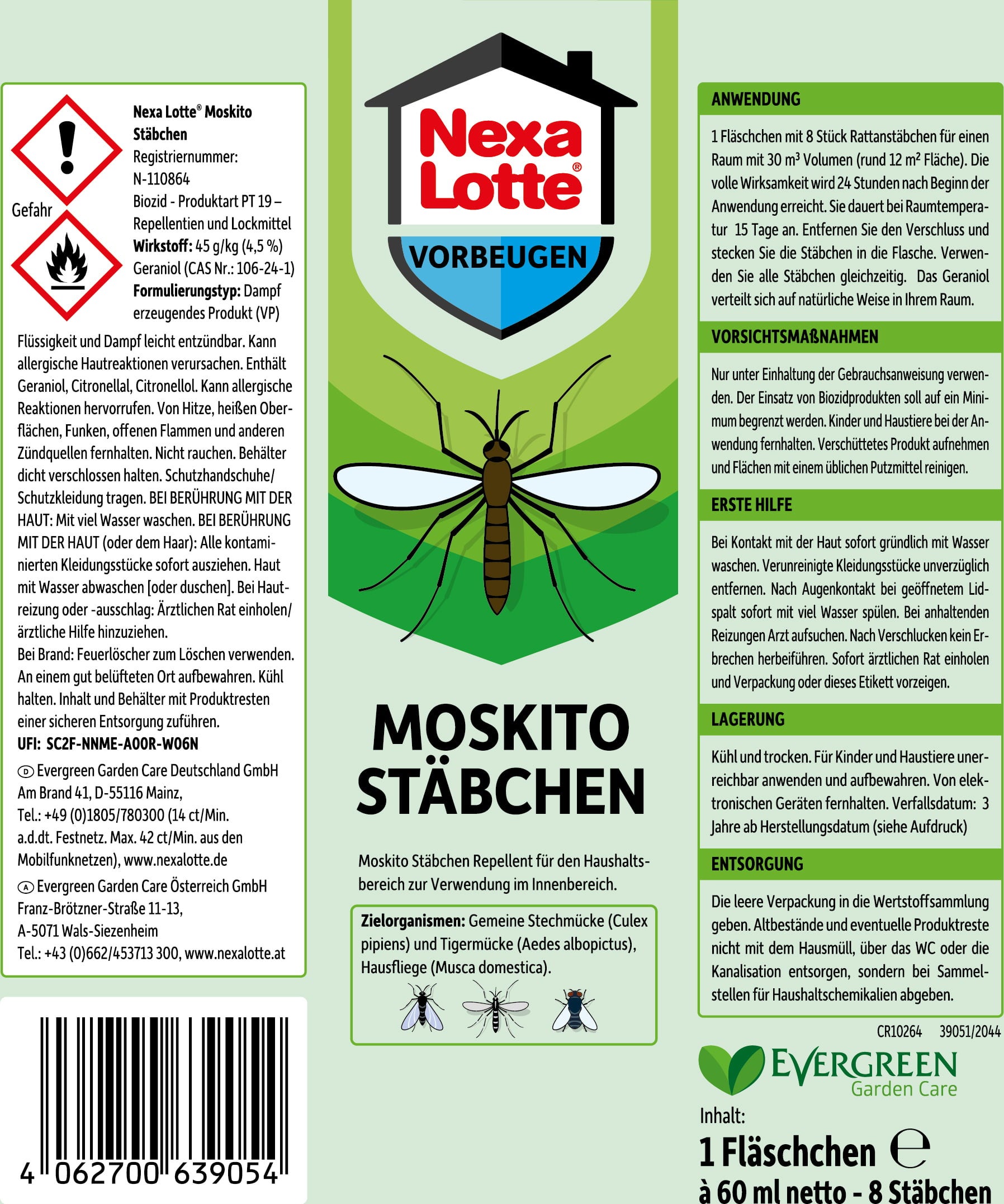 Fácil de usar: un frasco con 8 palitos de ratán es suficiente para un volumen de habitación de 30 m³ (aprox. 12 m² de superficie). Basta con quitar el tapón, introducir las varillas en el frasco y utilizar todas las varillas a la vez. El geraniol contenido en el frasco se difunde de forma natural en la habitación, proporcionando una defensa eficaz contra los mosquitos.