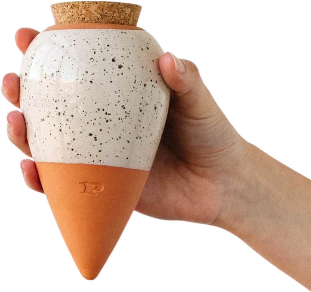 Olla no es sólo un elemento decorativo, sino también un práctico accesorio para tus plantas de interior. El cono de arcilla regula el flujo de agua y proporciona humedad a tu planta las 24 horas del día.
