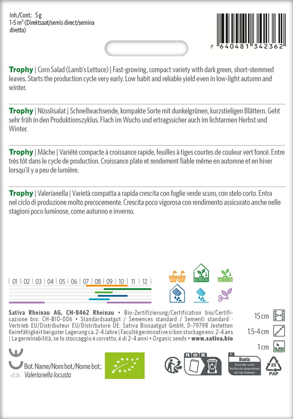 Esta variedad compacta y de crecimiento rápido convence por sus hojas de color verde oscuro y tallo corto, así como por su porte rastrero. Es ideal para el ciclo de producción temprano y ofrece rendimientos fiables incluso en condiciones de poca luz durante el otoño y el invierno. La variedad procede de una cuidadosa selección de conservación de Sativa en Rheinau, centrada en la calidad y la adaptación a las condiciones de cultivo.
