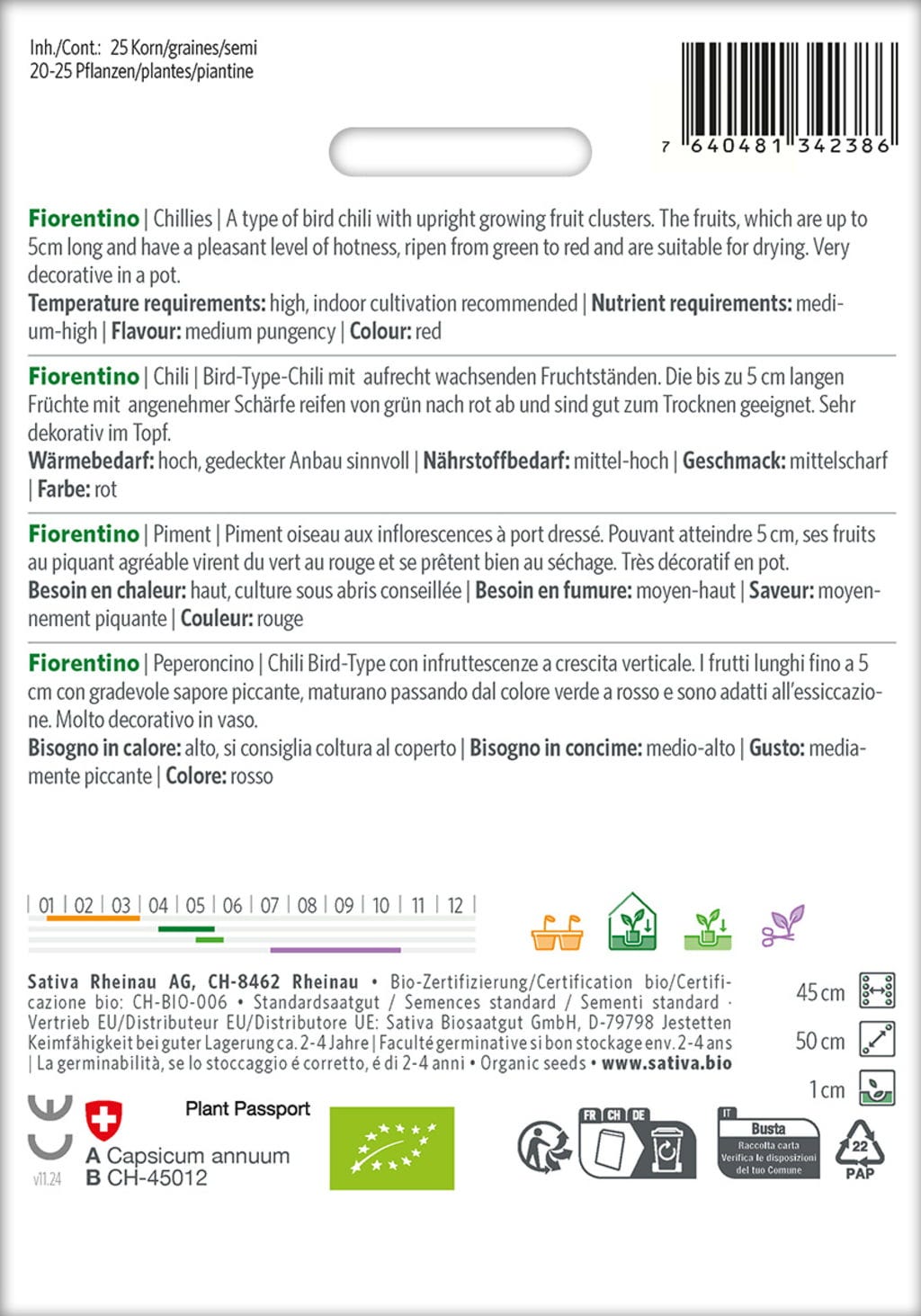 El chili Fiorentino destaca por sus racimos de frutos de crecimiento erguido y frutos de hasta 5 cm de largo que maduran de verde a rojo. Tiene un picor agradable y es perfecto para secar. También resulta especialmente decorativo en macetas.